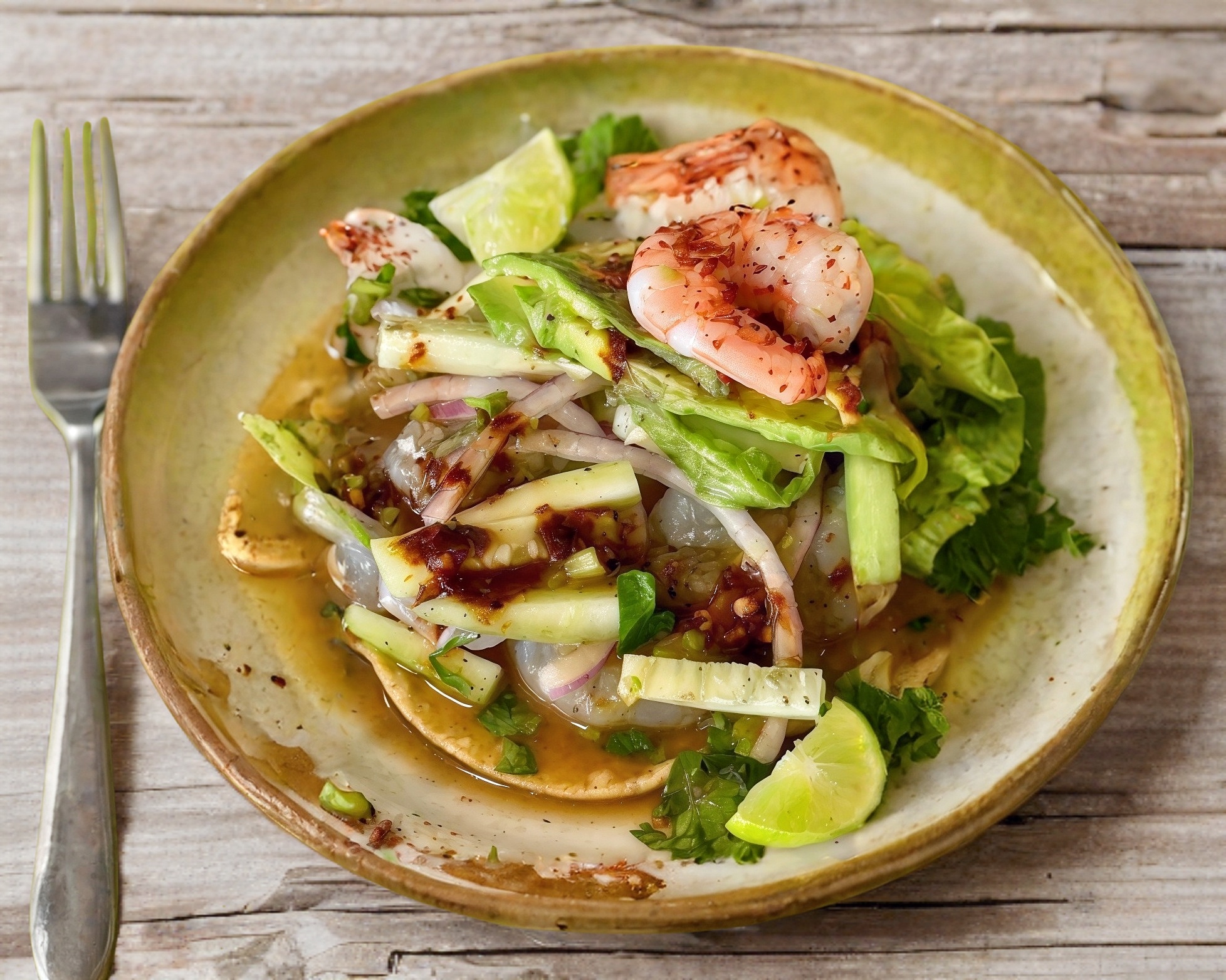 Camarón crudo preparado con limón, cebolla morada y pepino con salsas picosa de la casa..