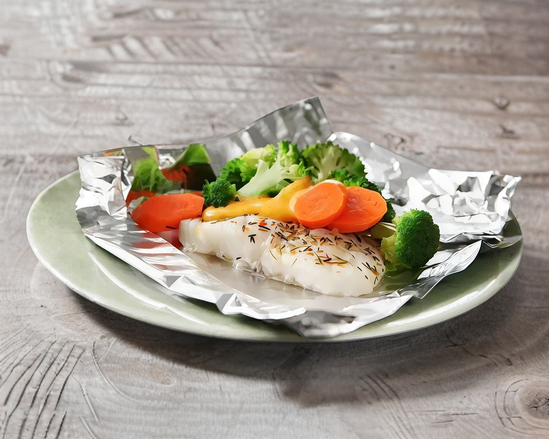 Pescado bagre con verduras cocidas, zanahoria, calabaza y ostión.