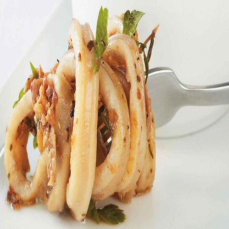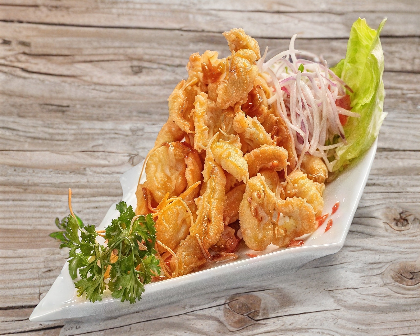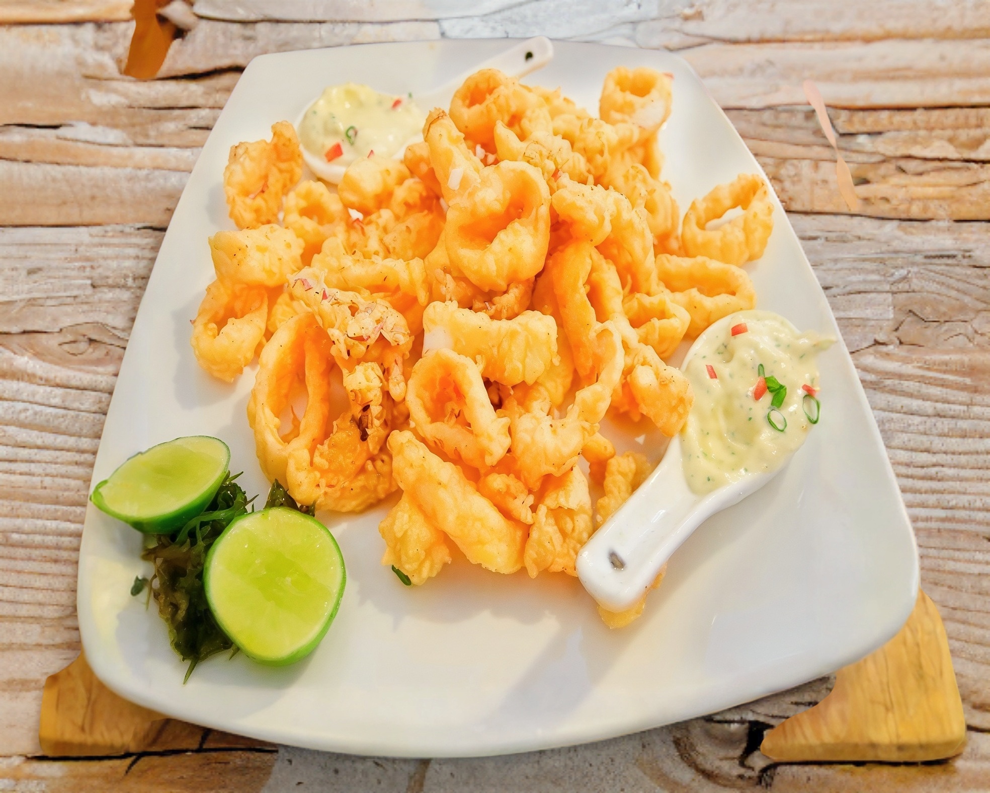 Relleno de mariscos (camarón y pulpo), queso mozzarella, envuelto en pan fino y bañado en salsa bechamel.
