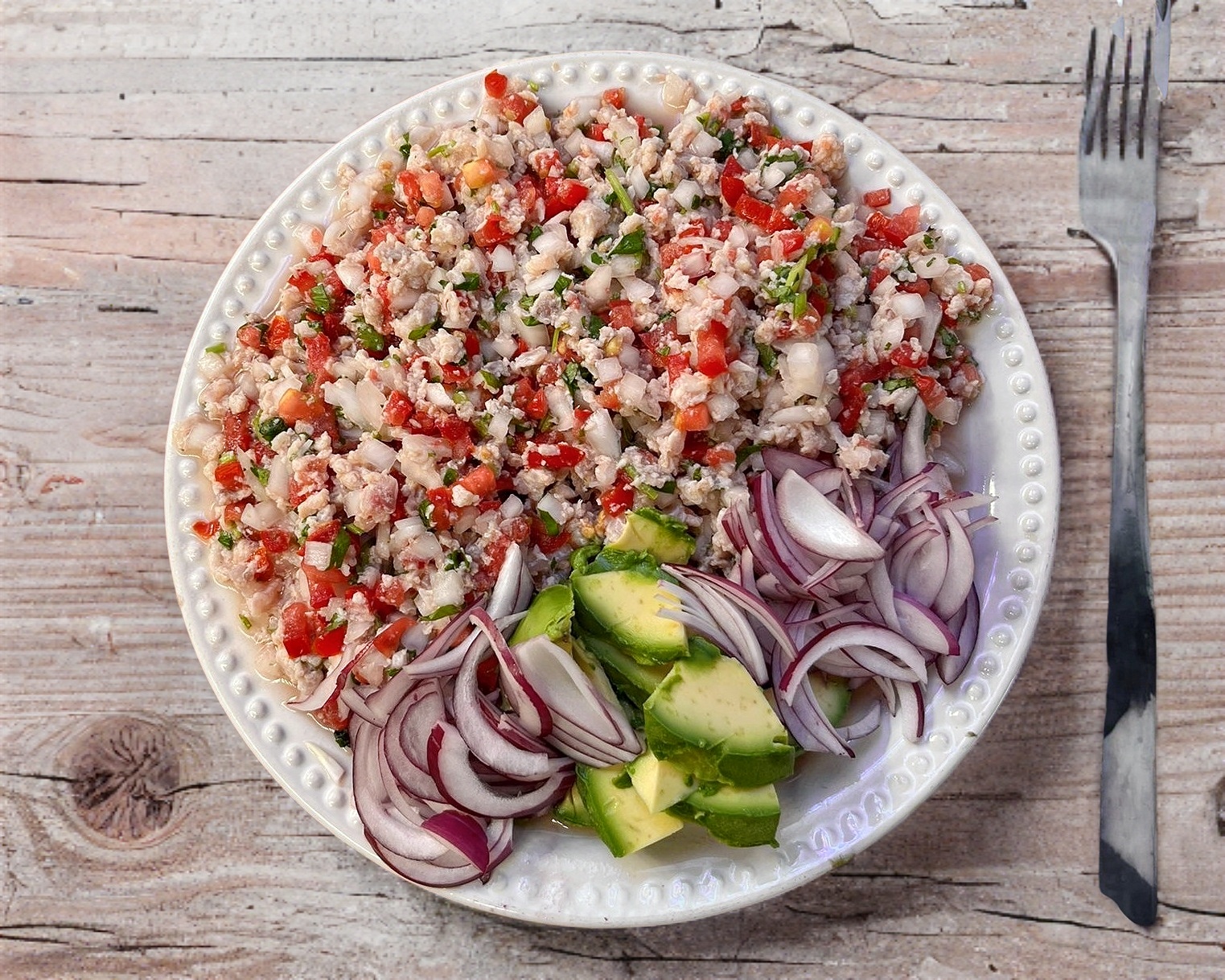 ceviche desnaturalizado mezclado con limón, jitomate, cilantro y cebolla.cantidad del 3/4 litro