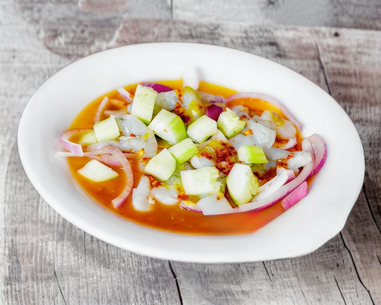 almeja peparada con salsas de aguachile y verduras frescas (jitomate, cebolla y pepino)