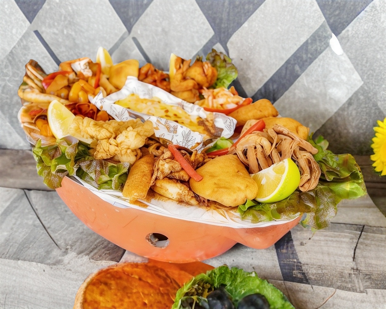 Para dos personas. Preparada con camarones diabla, ajo, empanizados, momia, pulpo al ajillo, filete empanizado y jaiba mantequilla.