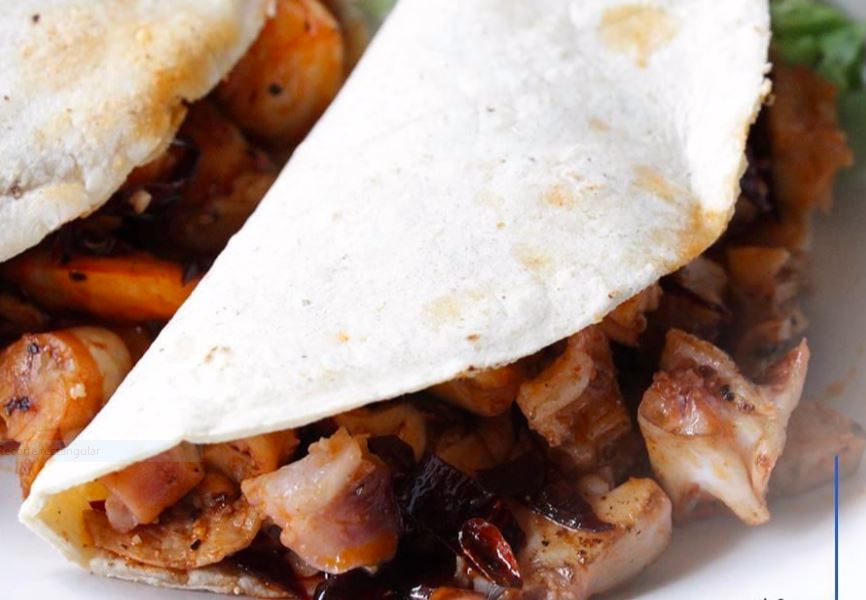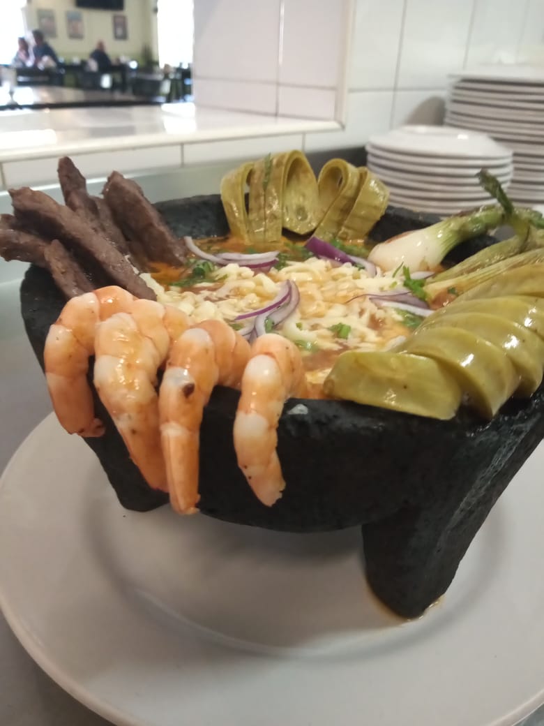Exquisita combinación de mariscos y suaves fajitas de arrachera, cocinadas, a las brazas y se acompaña con cebollitas, panela y nopal.