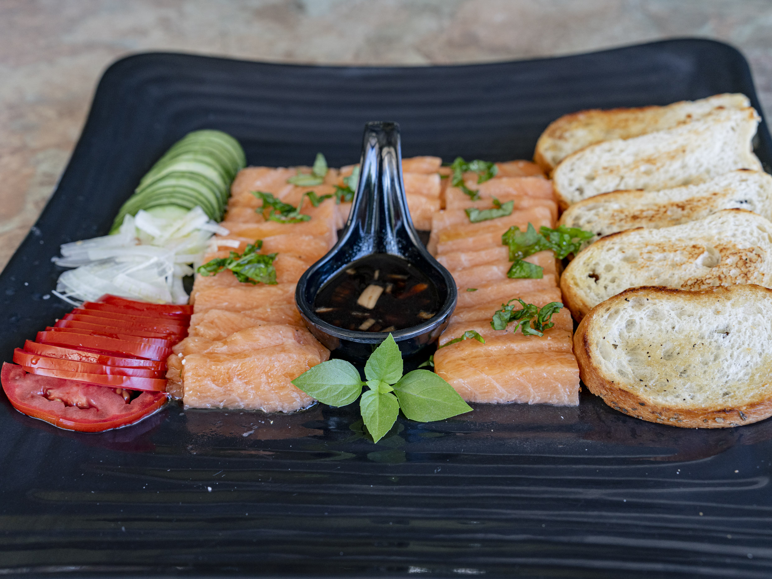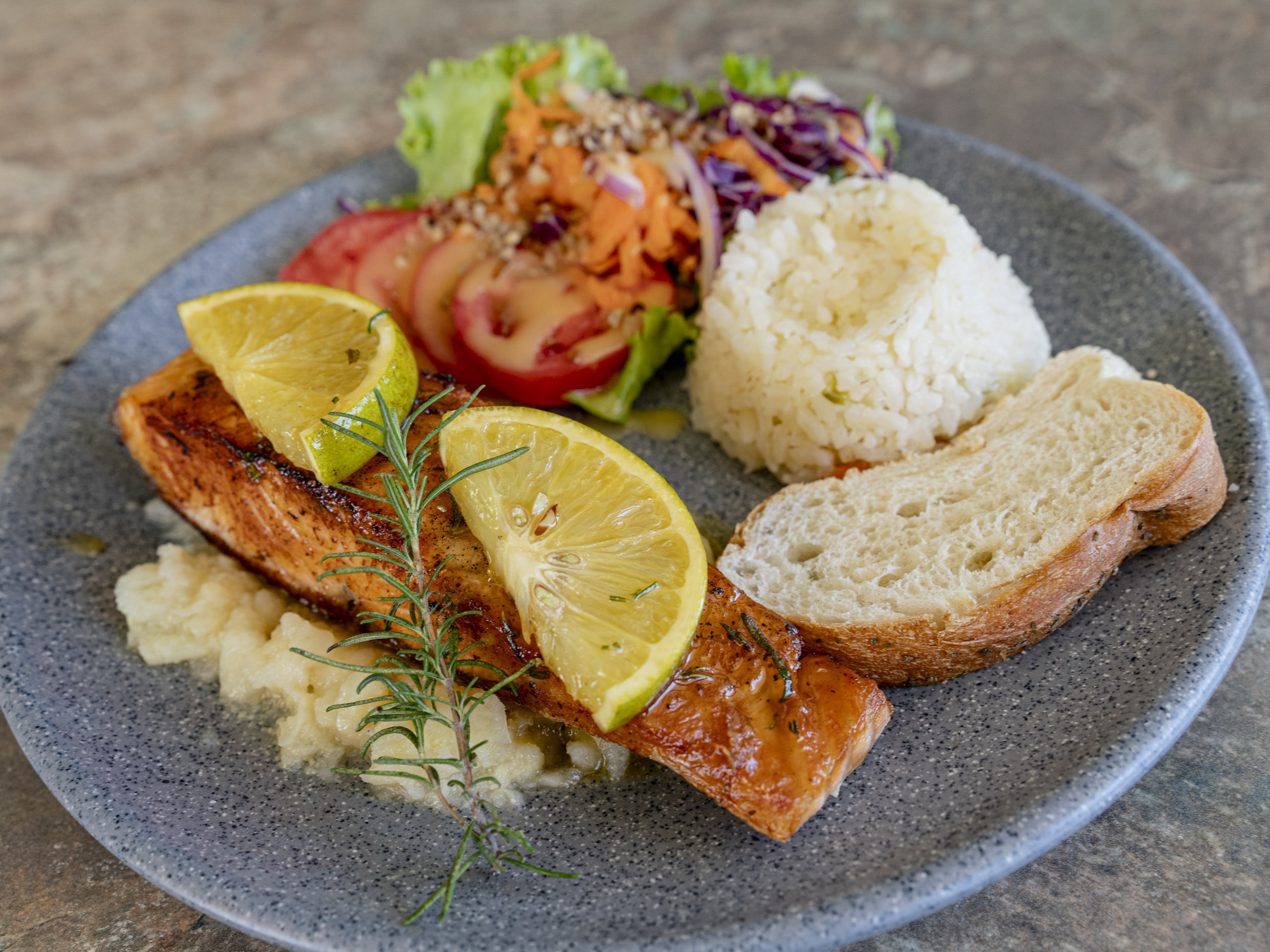 Exquisita lonja de salmón preparado al gusto: Zarandeado, mojo de ajo, mantequilla y ajillo.