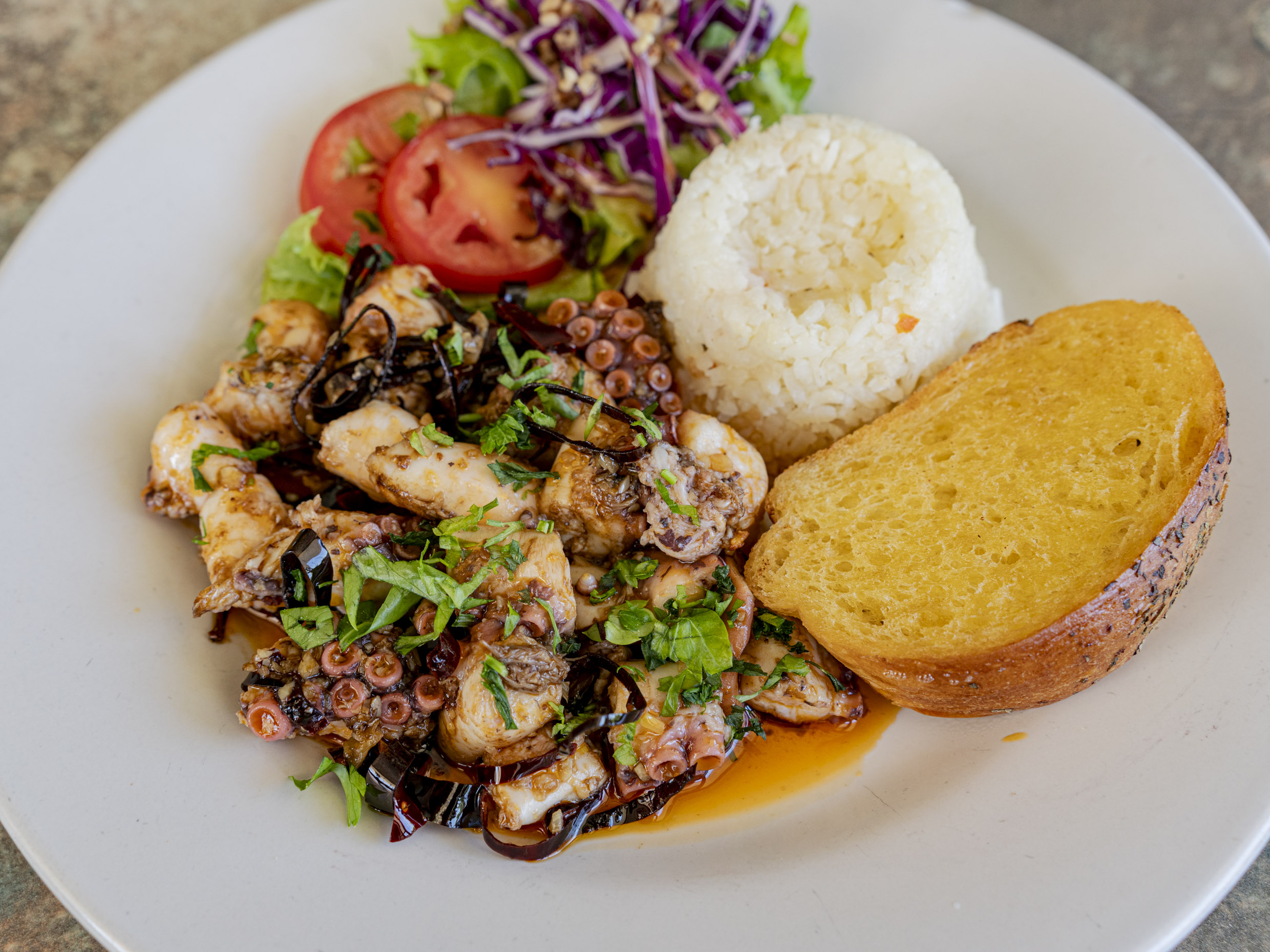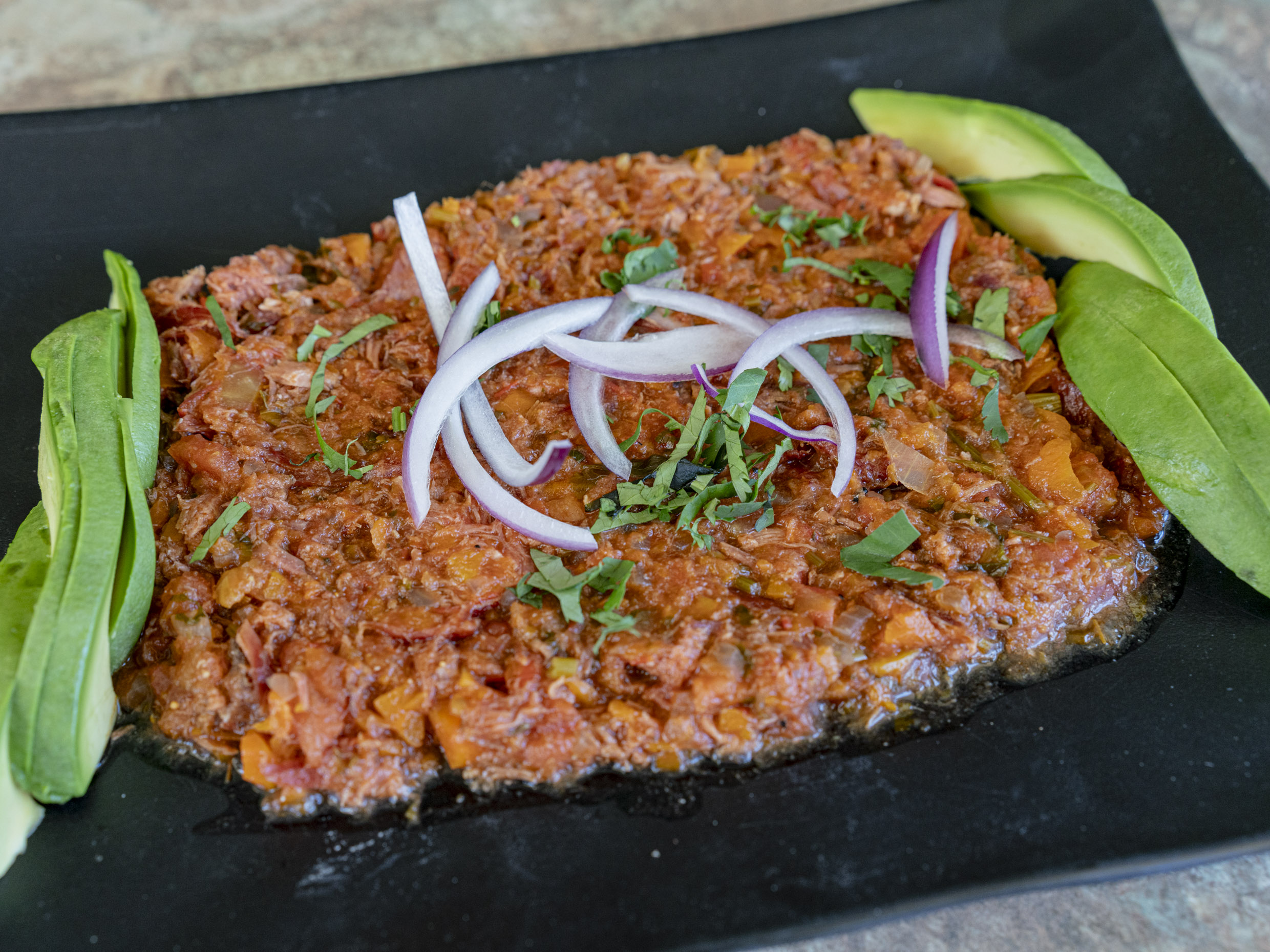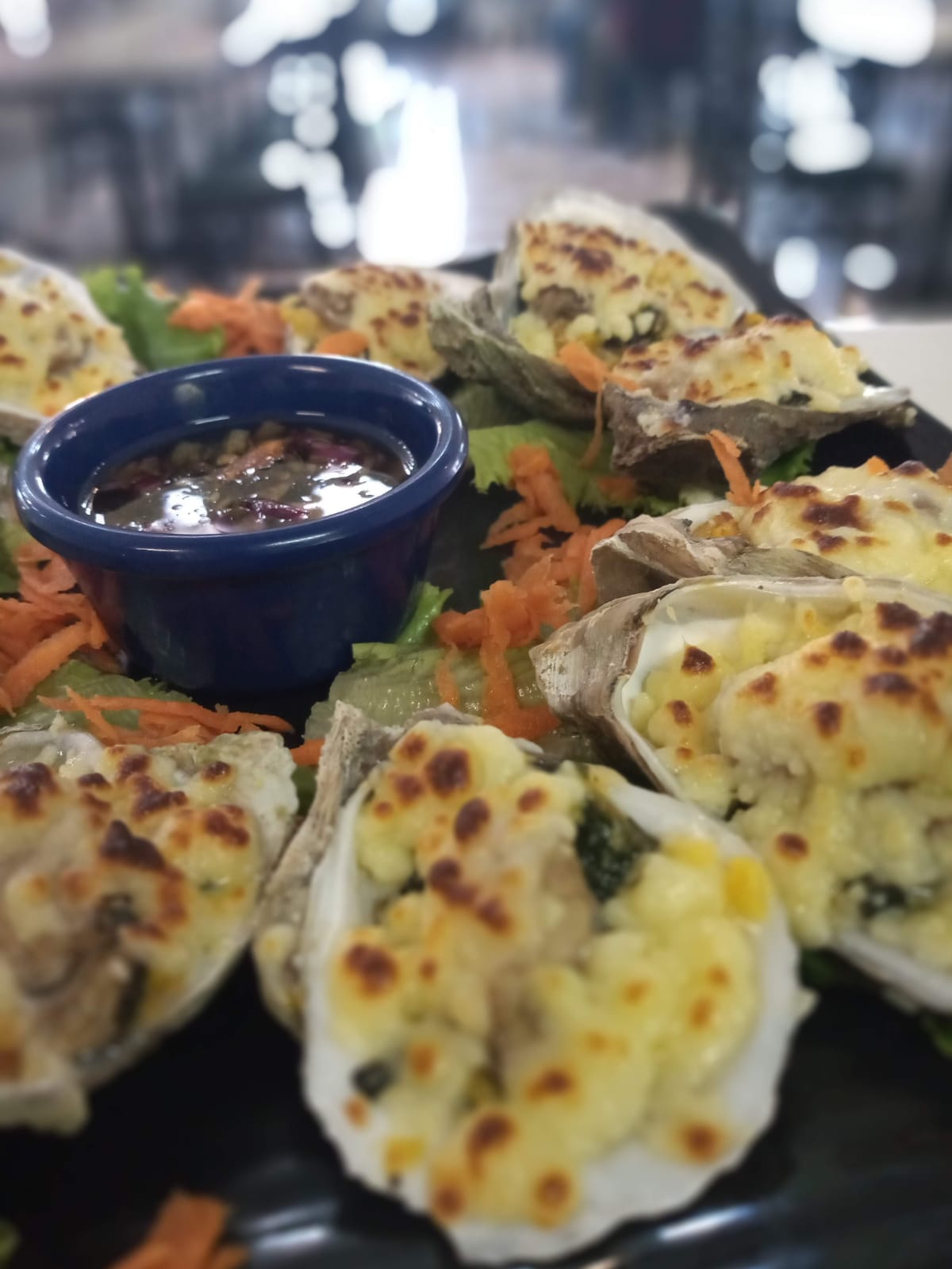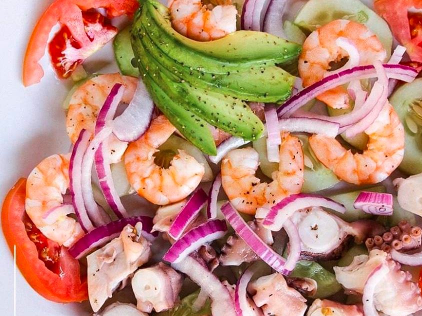 Un sabroso guisado de camarón, pulpo, ostión y callo de almeja con jitomate, cebolla y queso fundido.