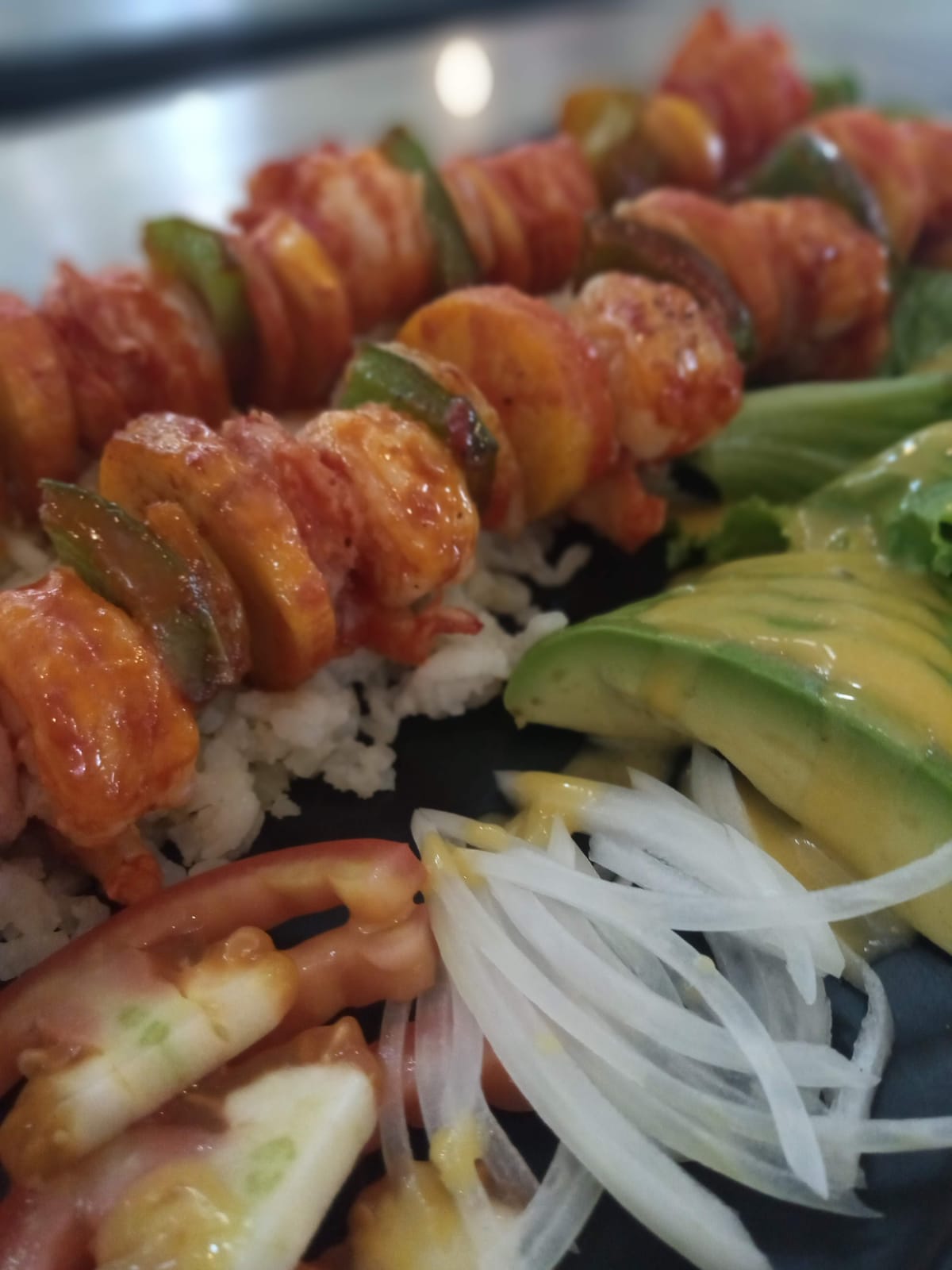 Una sabrosa de camarón asado a la parrilla, envueltos en tocino, acompañados de cebolla, jitomate y plátano macho.