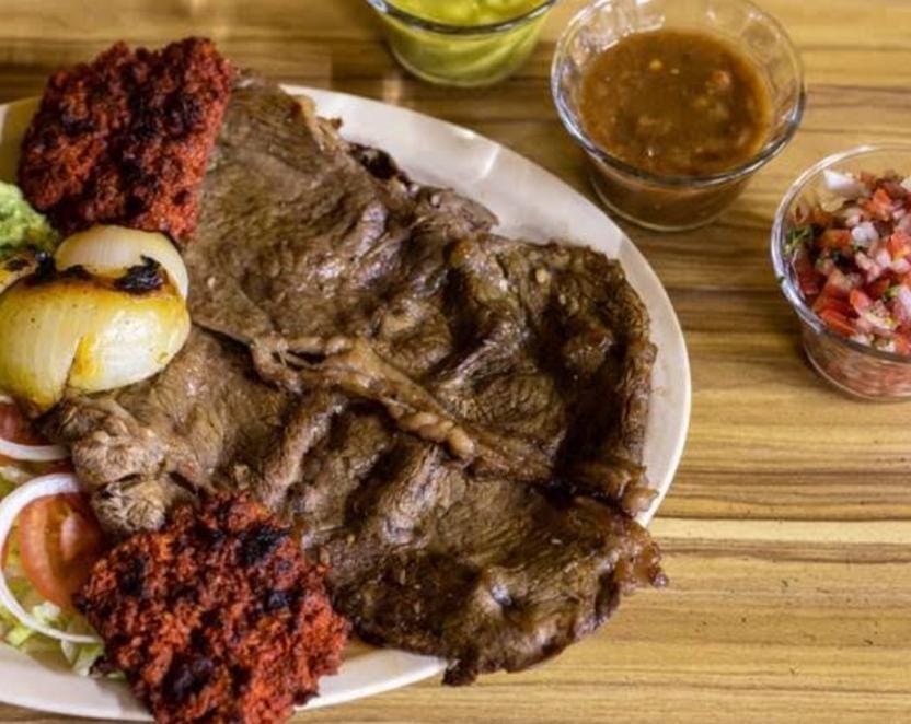 Salsa roja, pollo, res, arrachera, camarón, filete, pulpo, cebolla cambray, nopal, panela y queso gratinado. Porción para 2 personas.