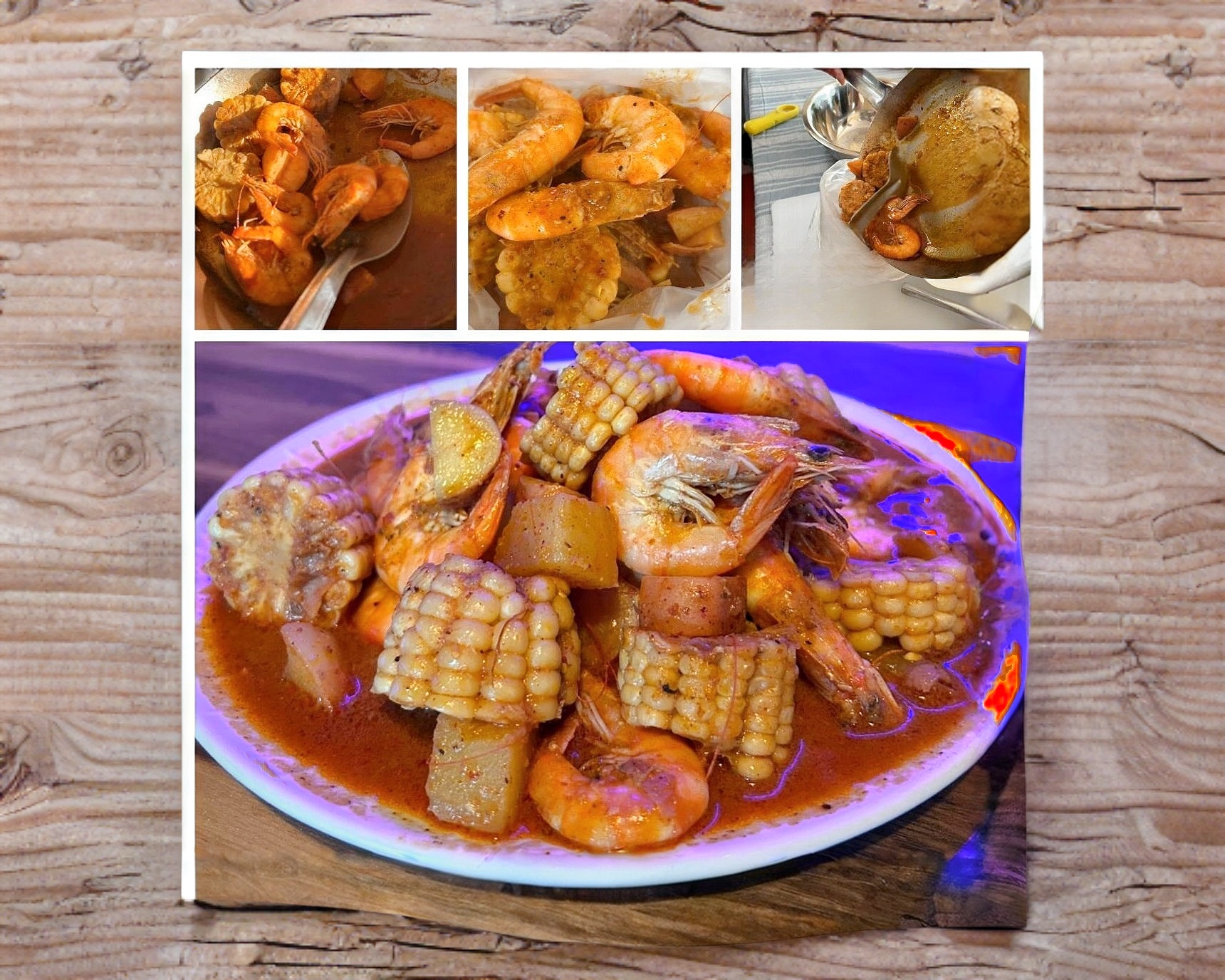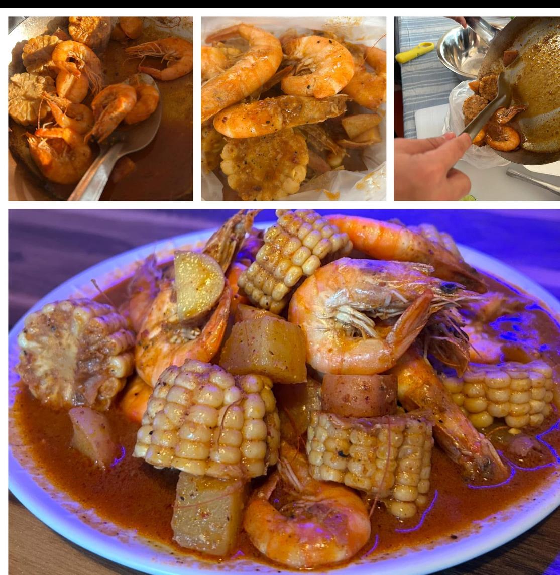 Camarones acompañados con una salsa de varios polvos, mantequilla y un toque de ajo, acompañados con papa cambray y elote.