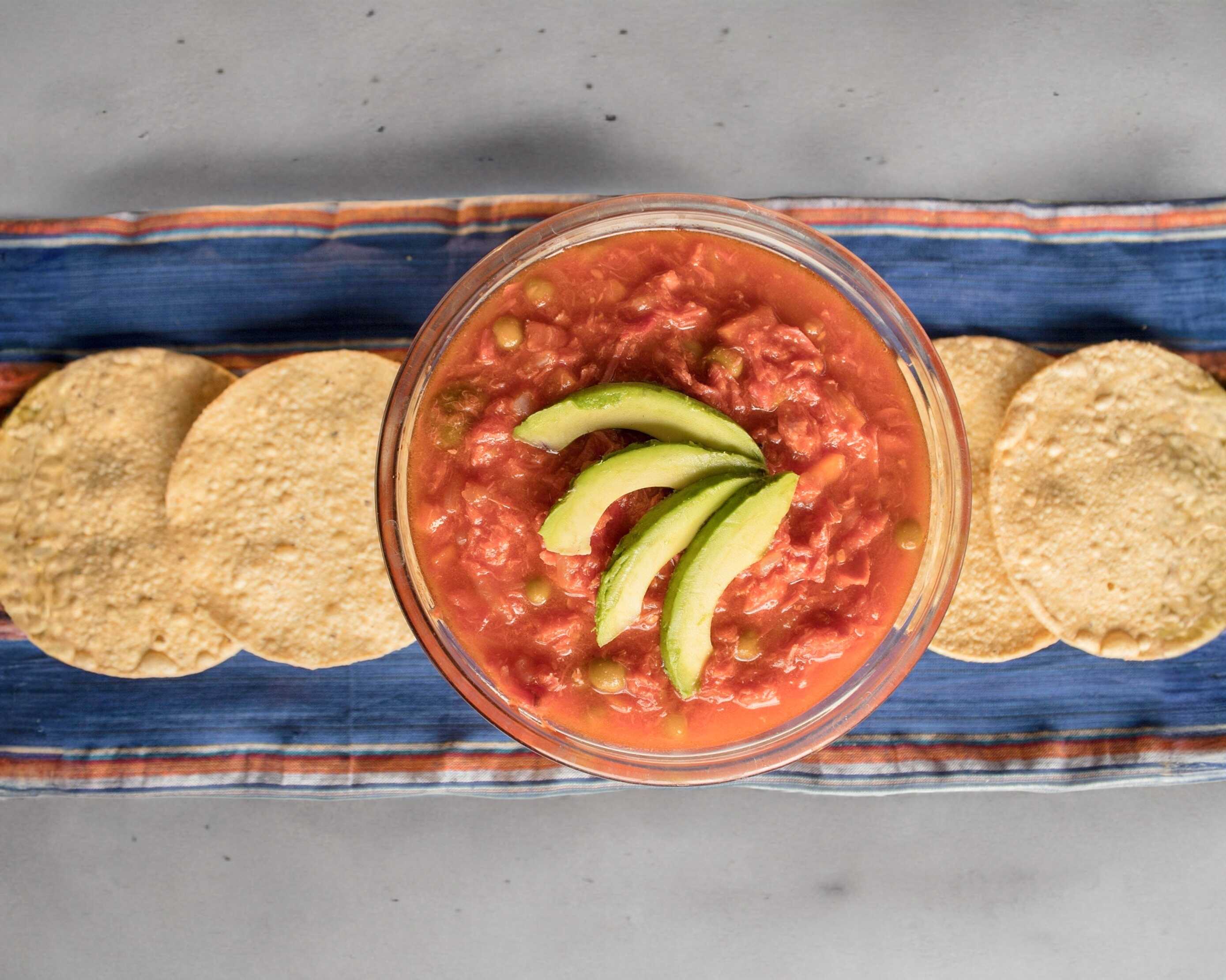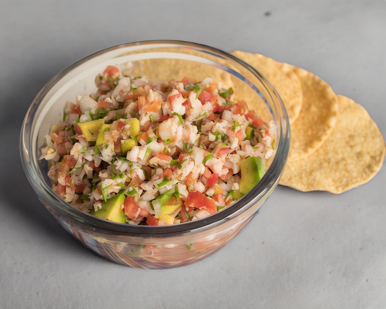 Ceviche de pescado molido con jitomate, cebolla, cilantro y aguacate.