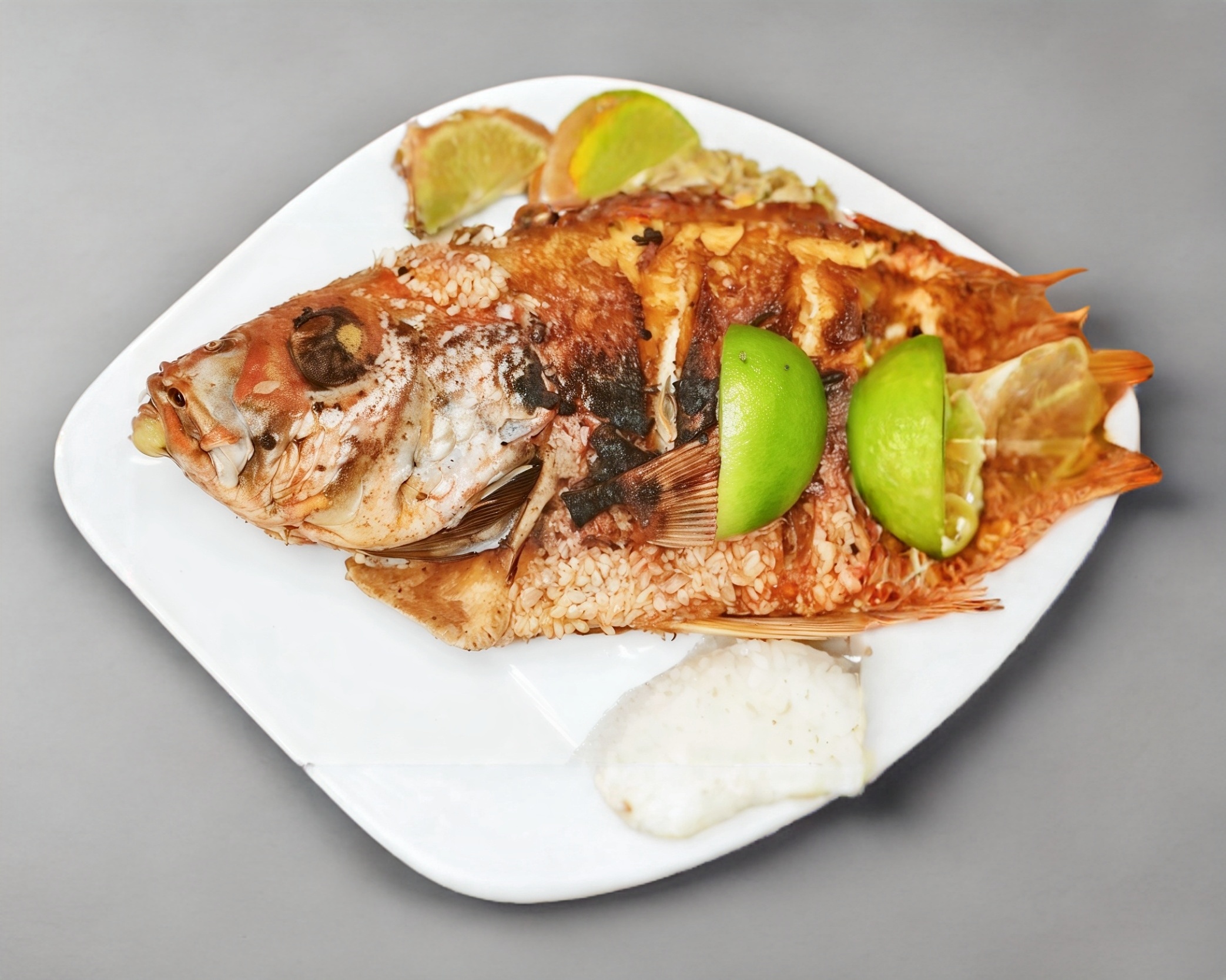 Mojarra frita acompañada de ensalada verde y sopa de arroz blanco.
