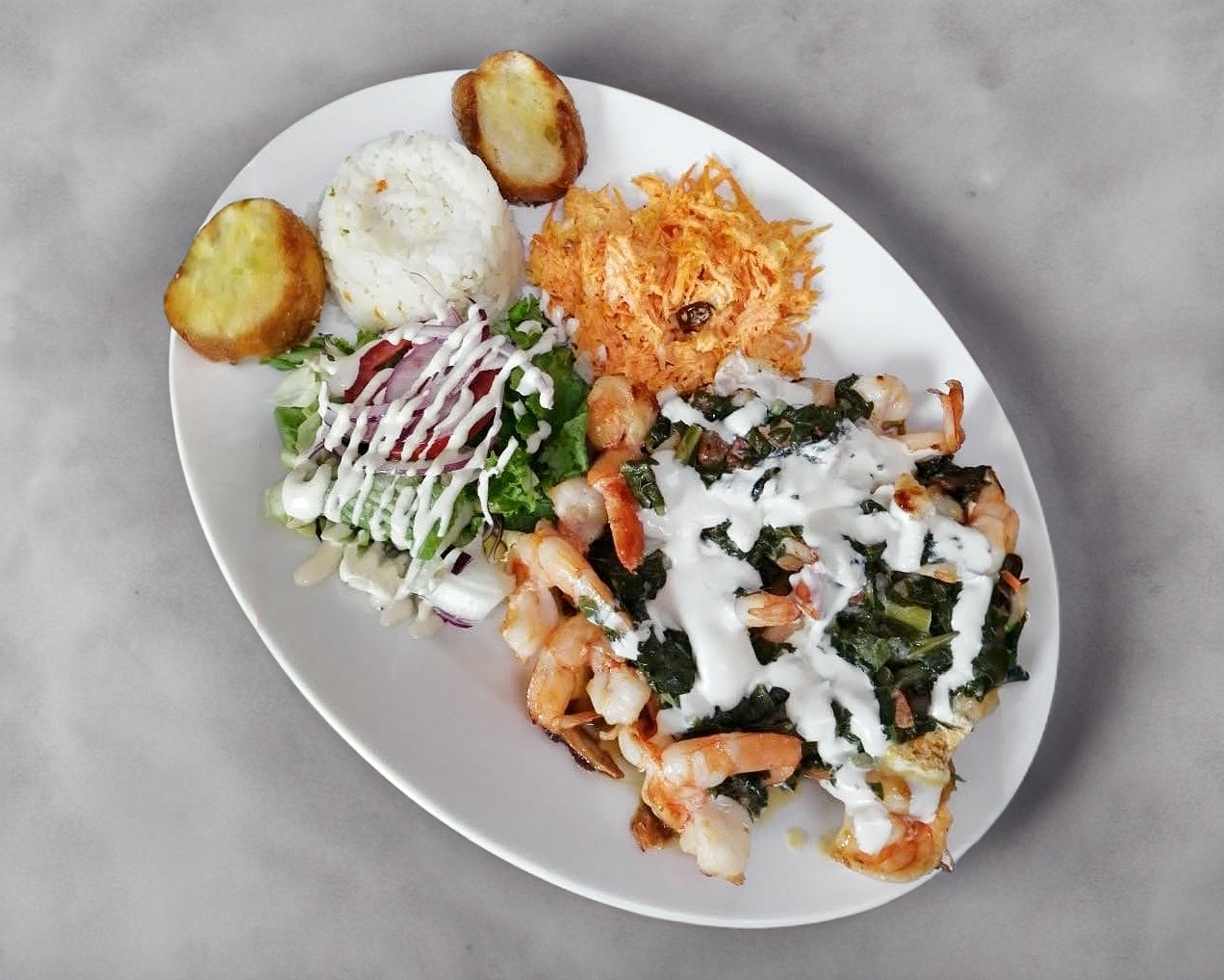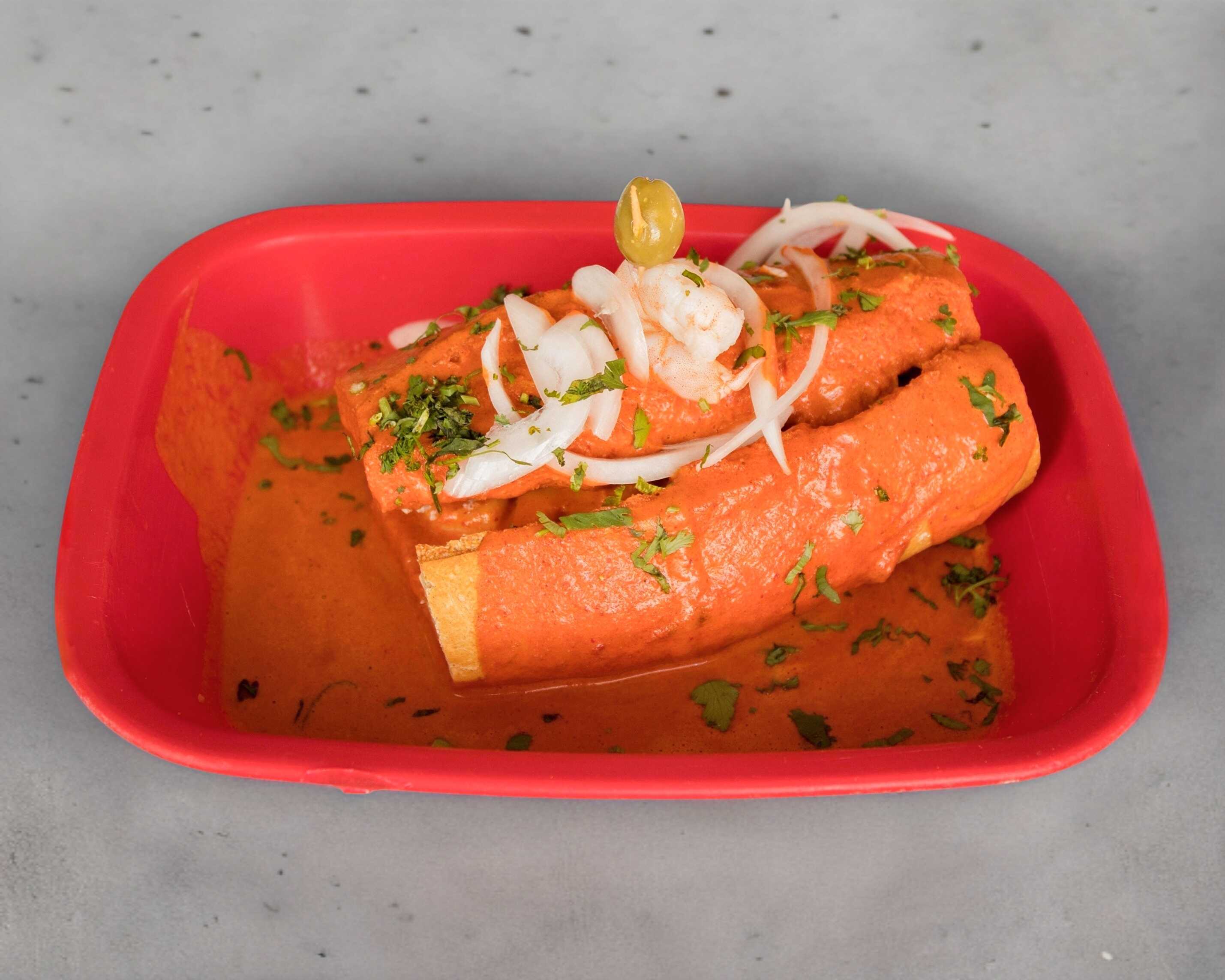 Varas con Camarón, chile morrón, cebolla y plátano macho.