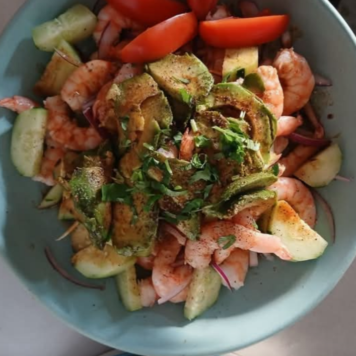 Ceviche de camarón cocido. Contiene mariscos.
