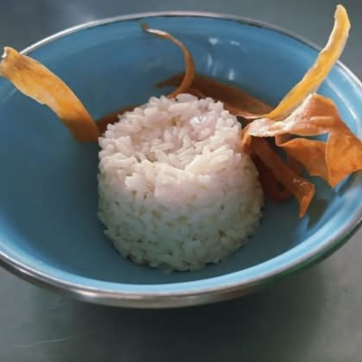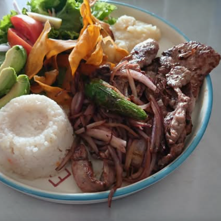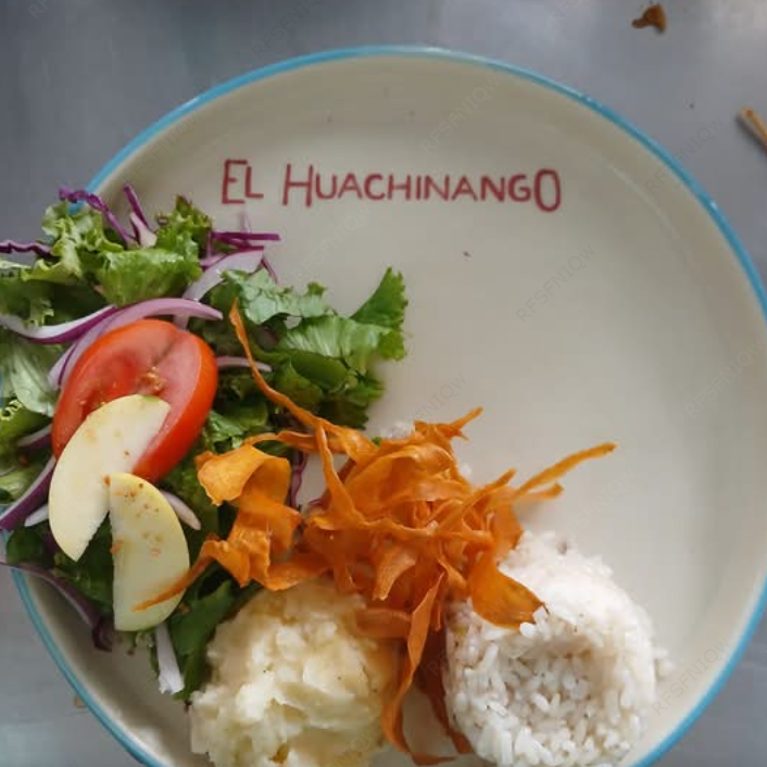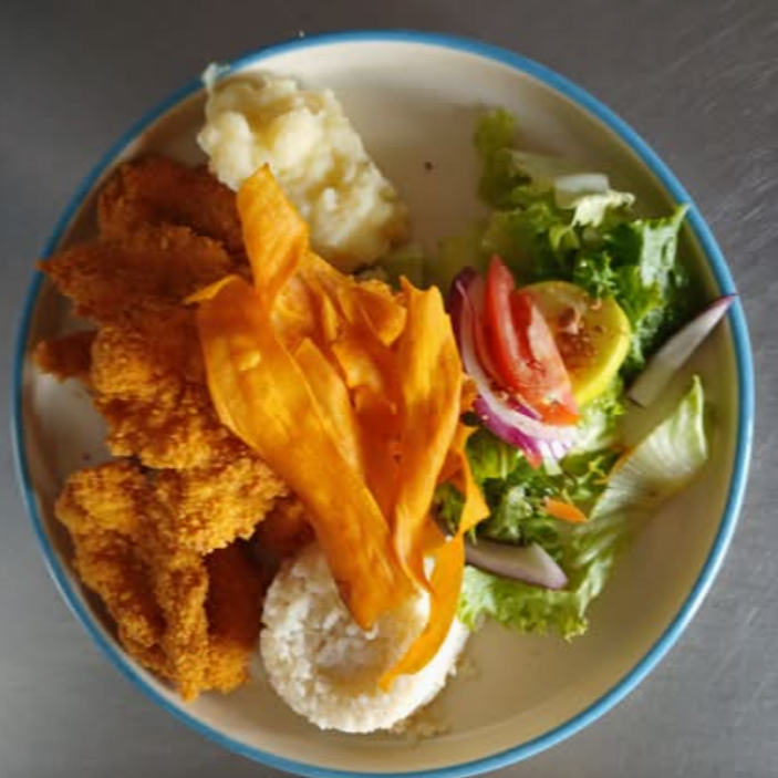 Crujientes camarones en un platillo muy especial, acompañados por la clásica sopa de arroz, puré de papa y ensalada fresca.