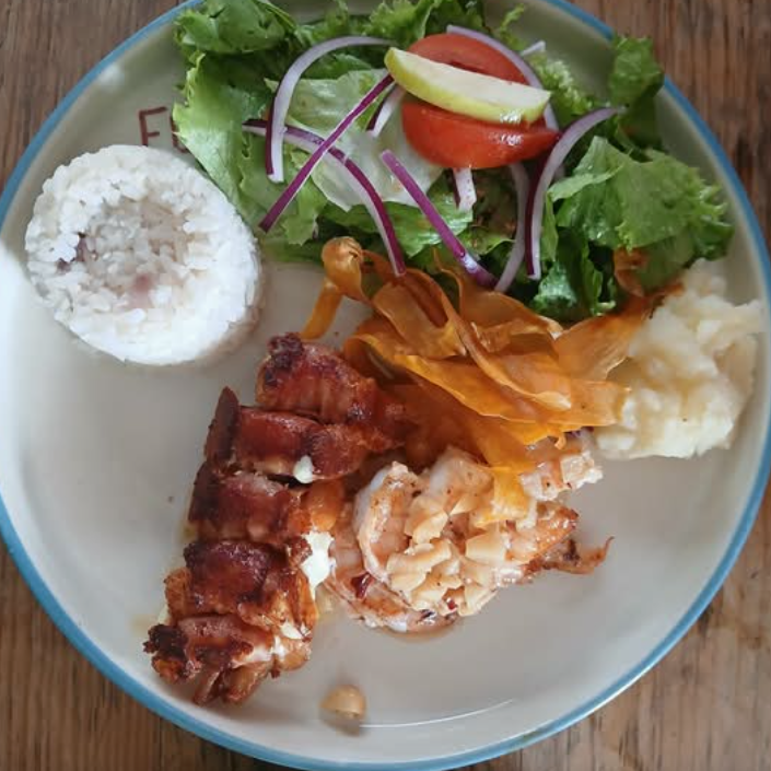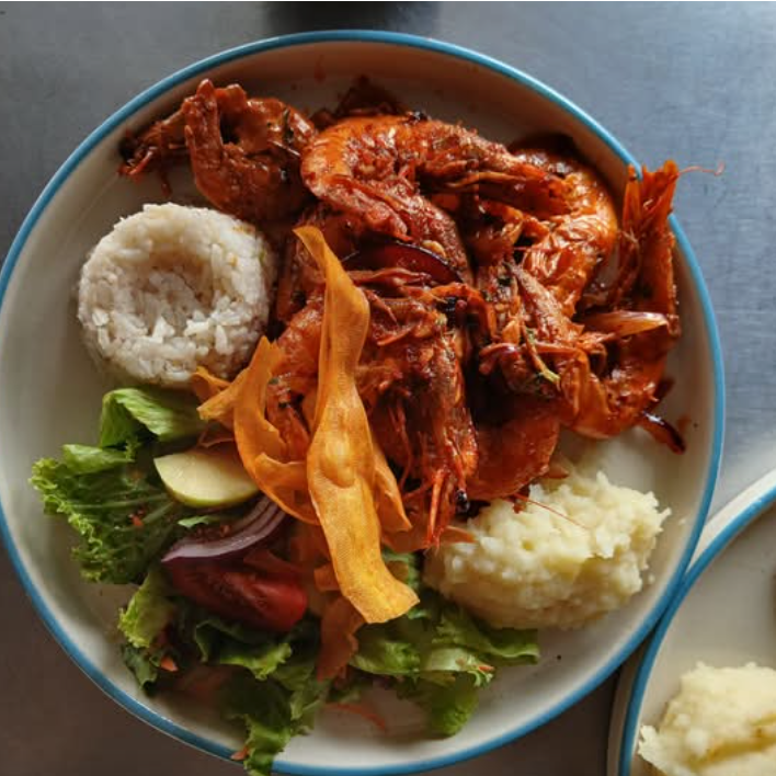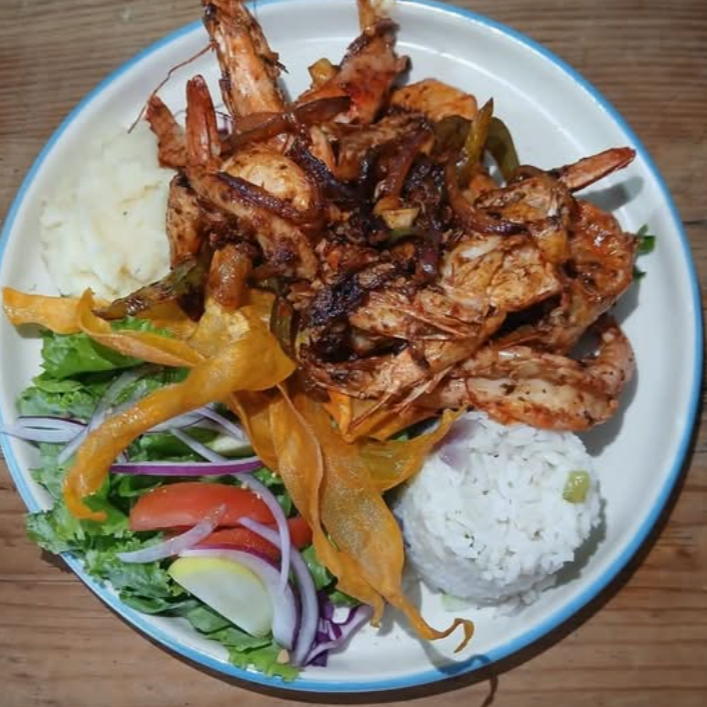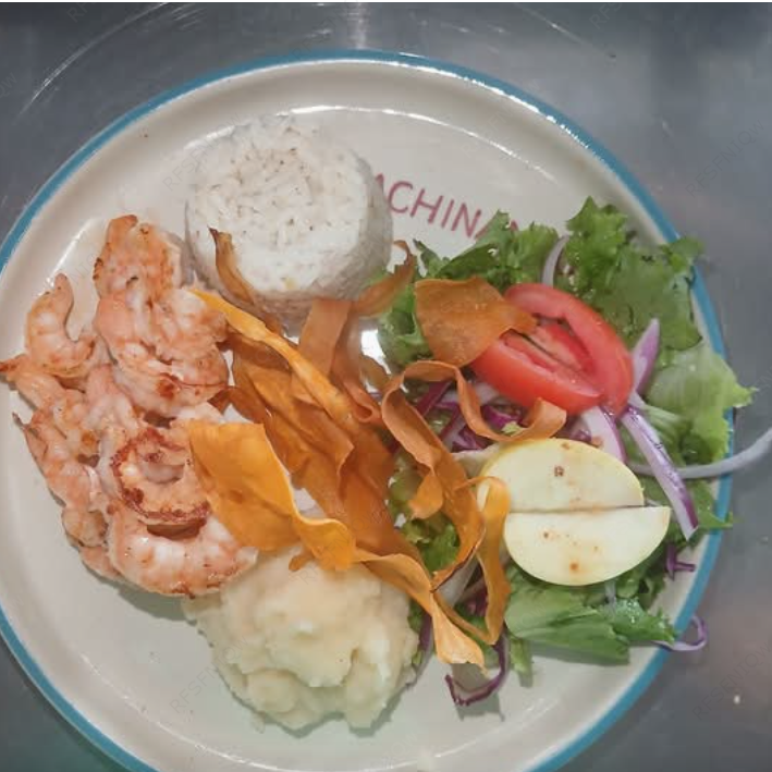 Deliciosos camarones acompañados de ensalada fresca, puré de papa y arroz.