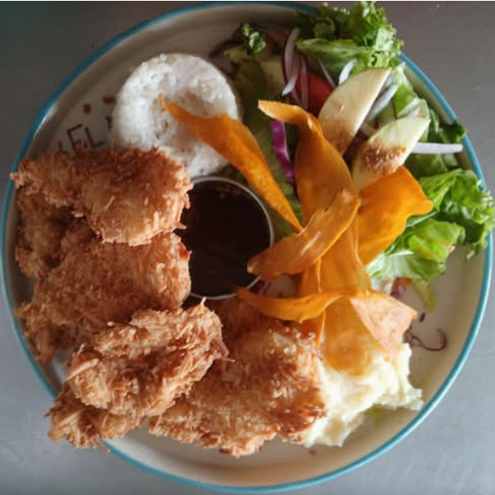 Ricos camarones al coco, con un dip de mango habanero, acompañados de ensalada fresca, arroz y puré de papa.