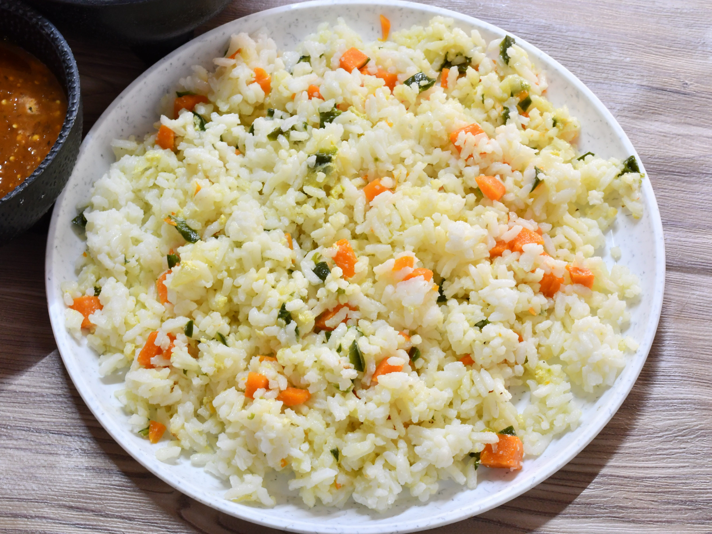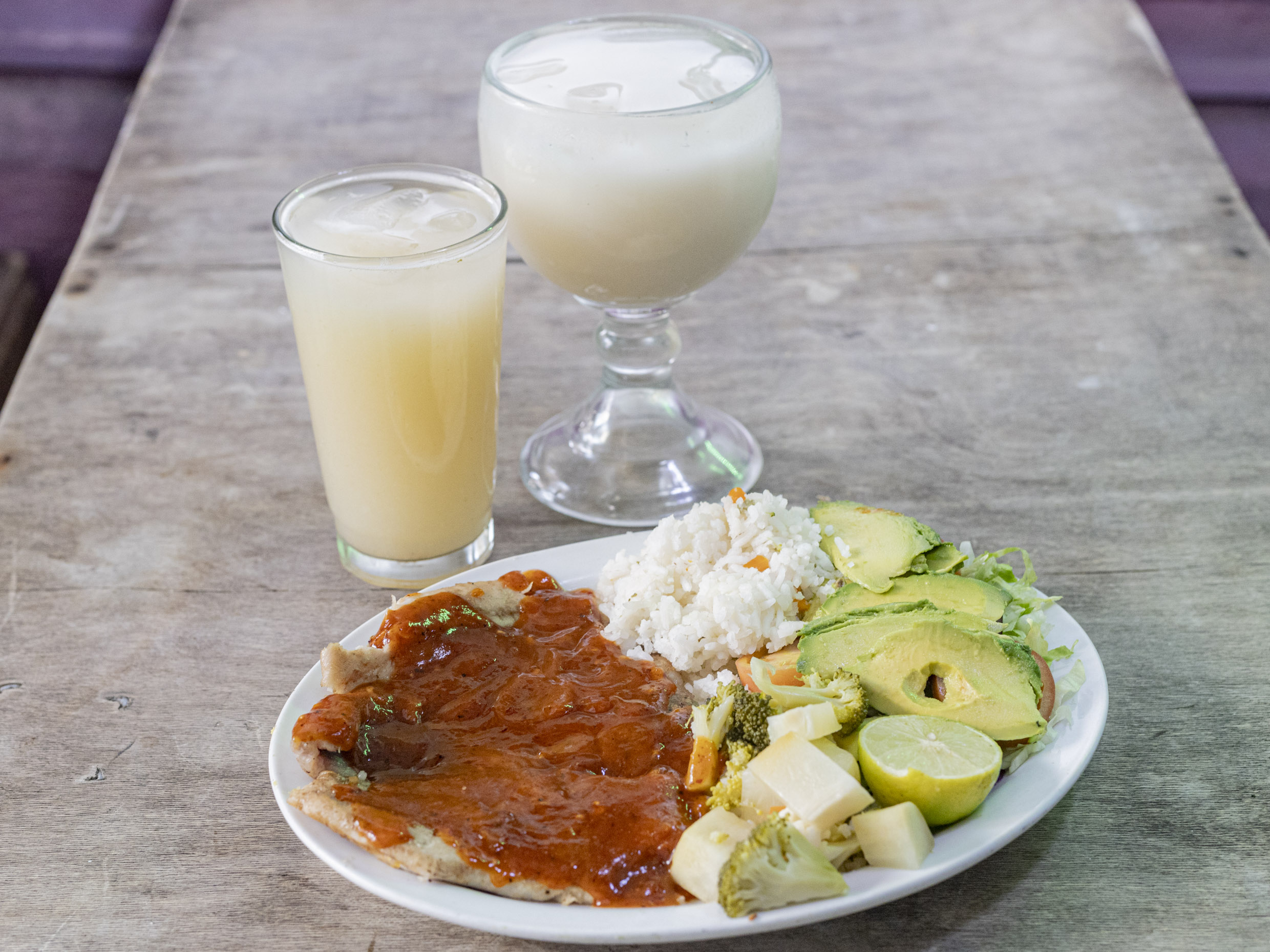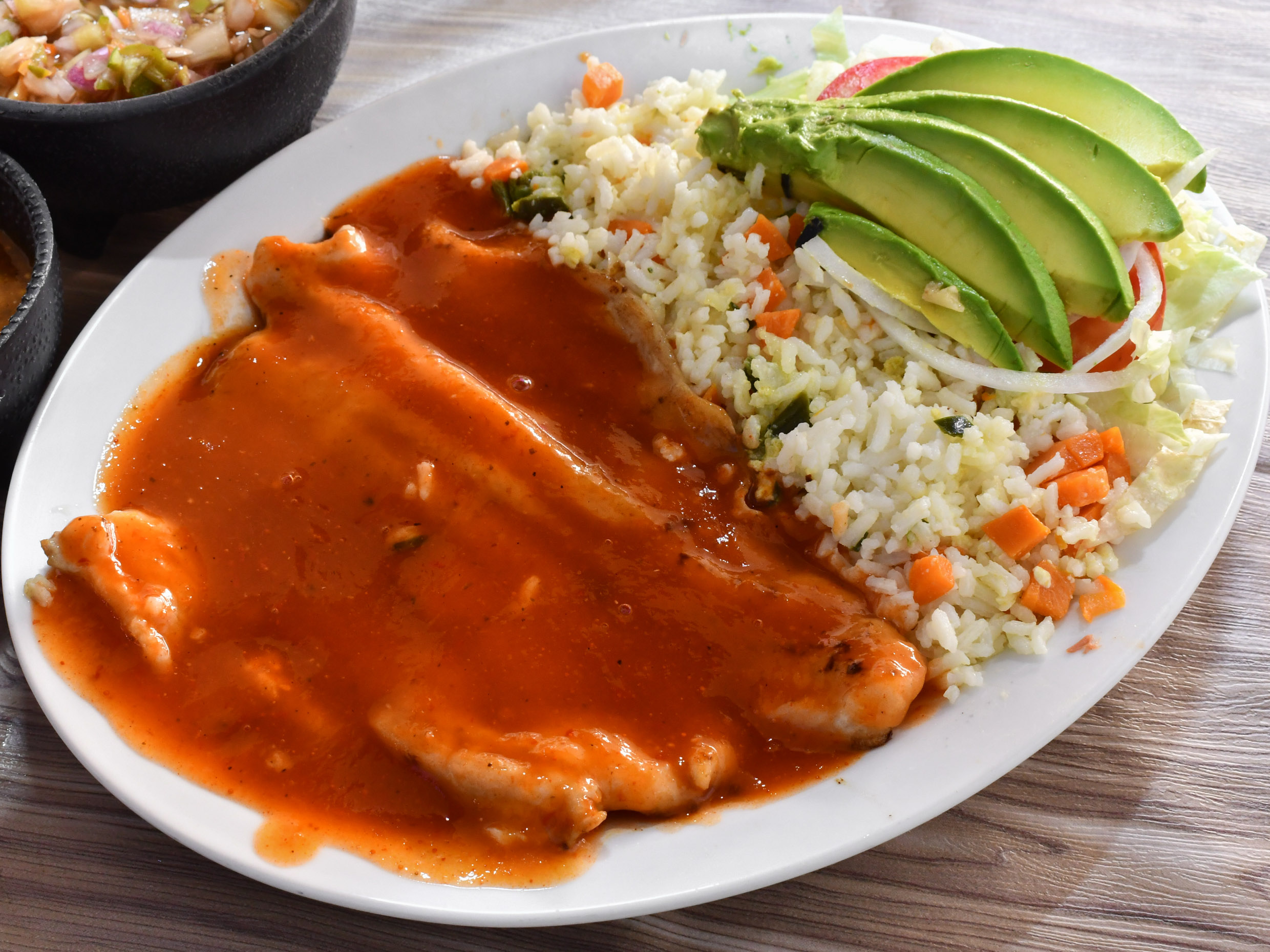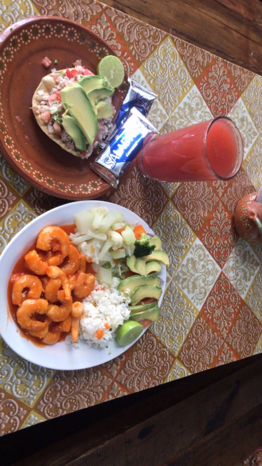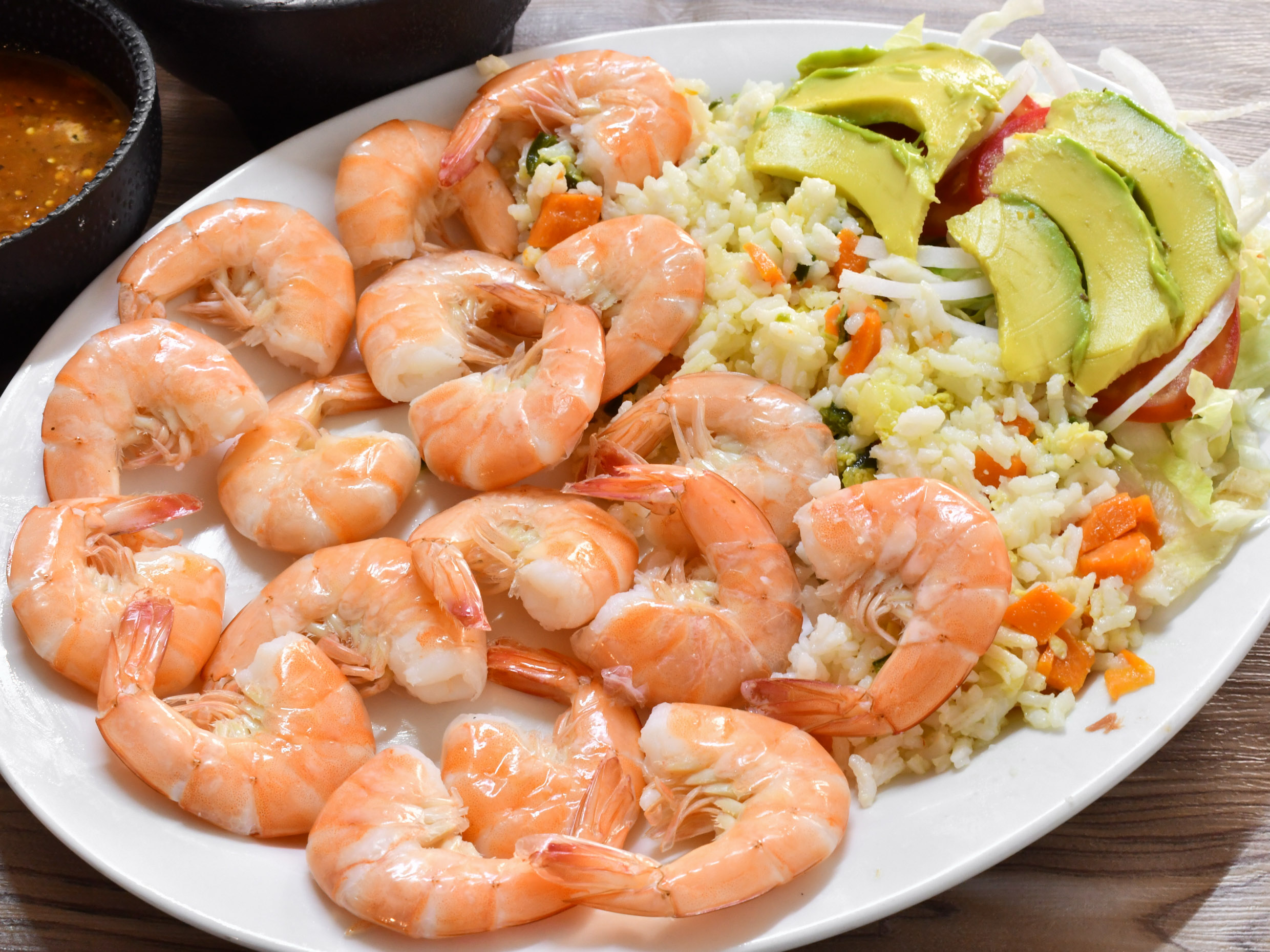 Camarones a la diabla, con arroz, ensalada y verduras.