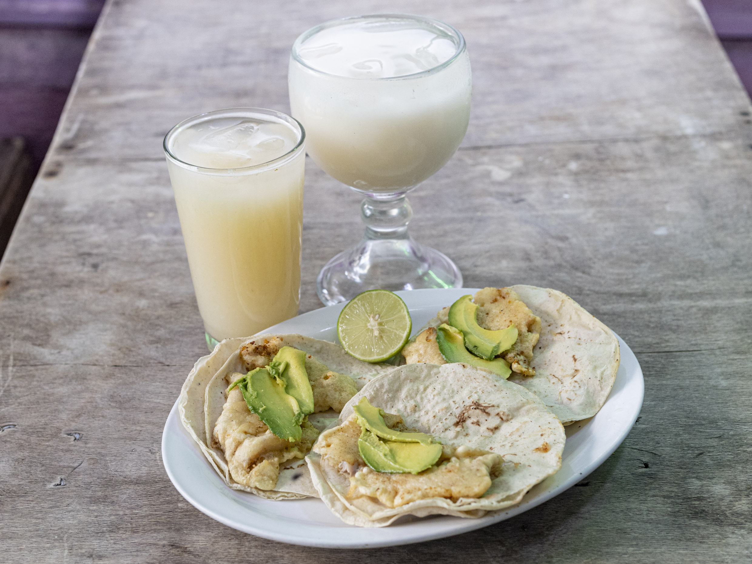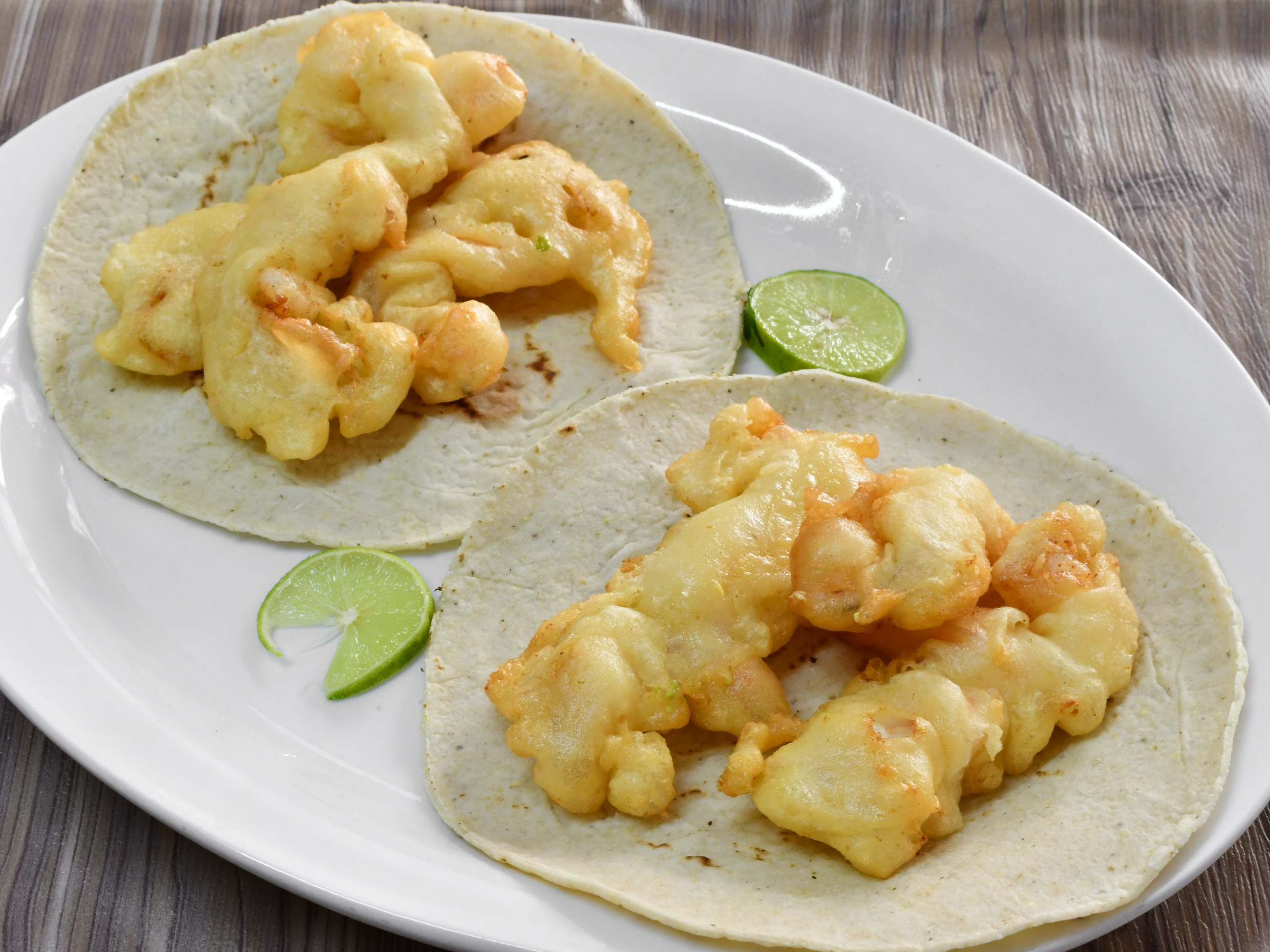 Taco de Camarón contiene tortilla de maiz, camaron capeado, salsas aparte, limon aparte, aderezo aparte