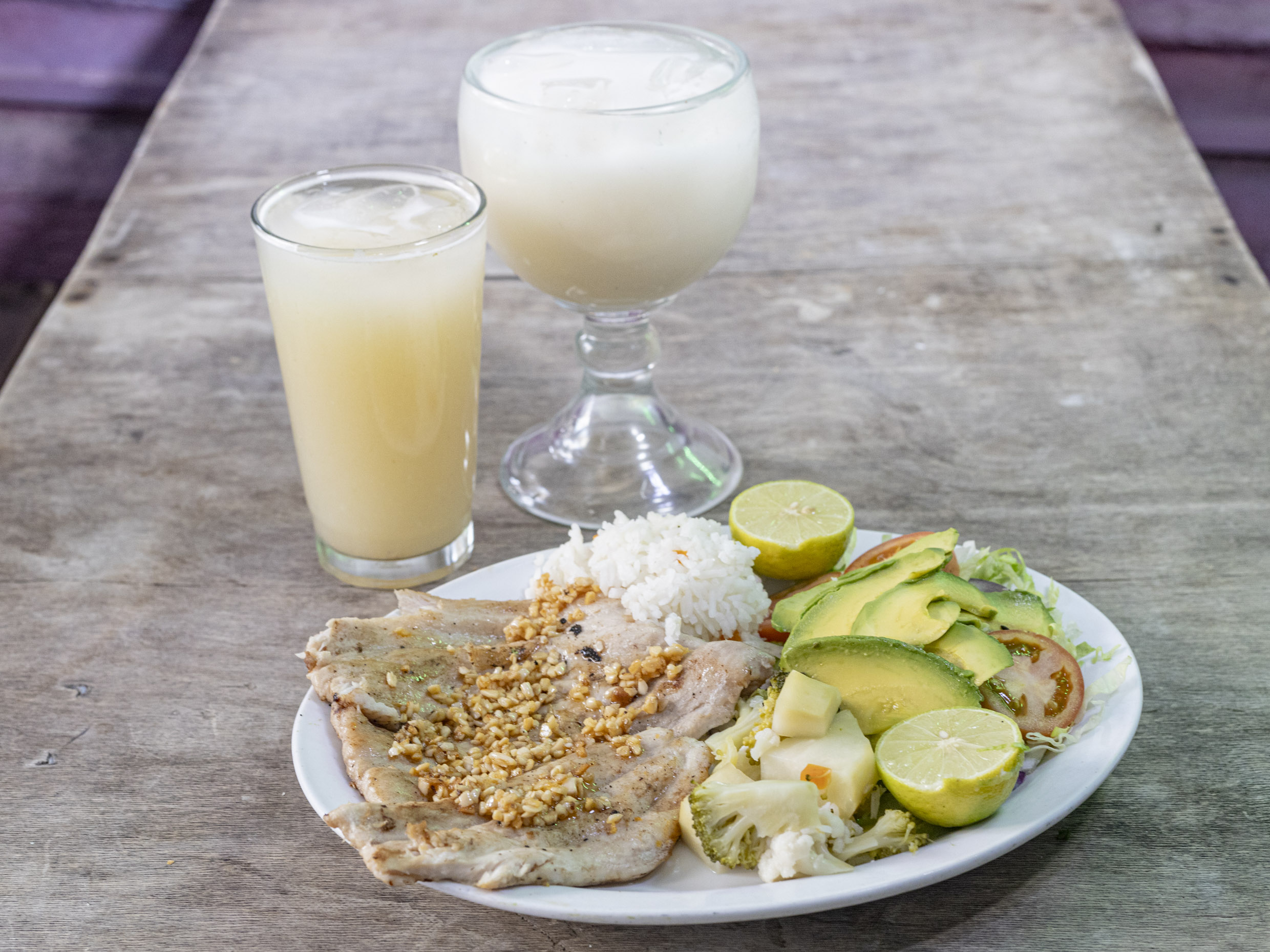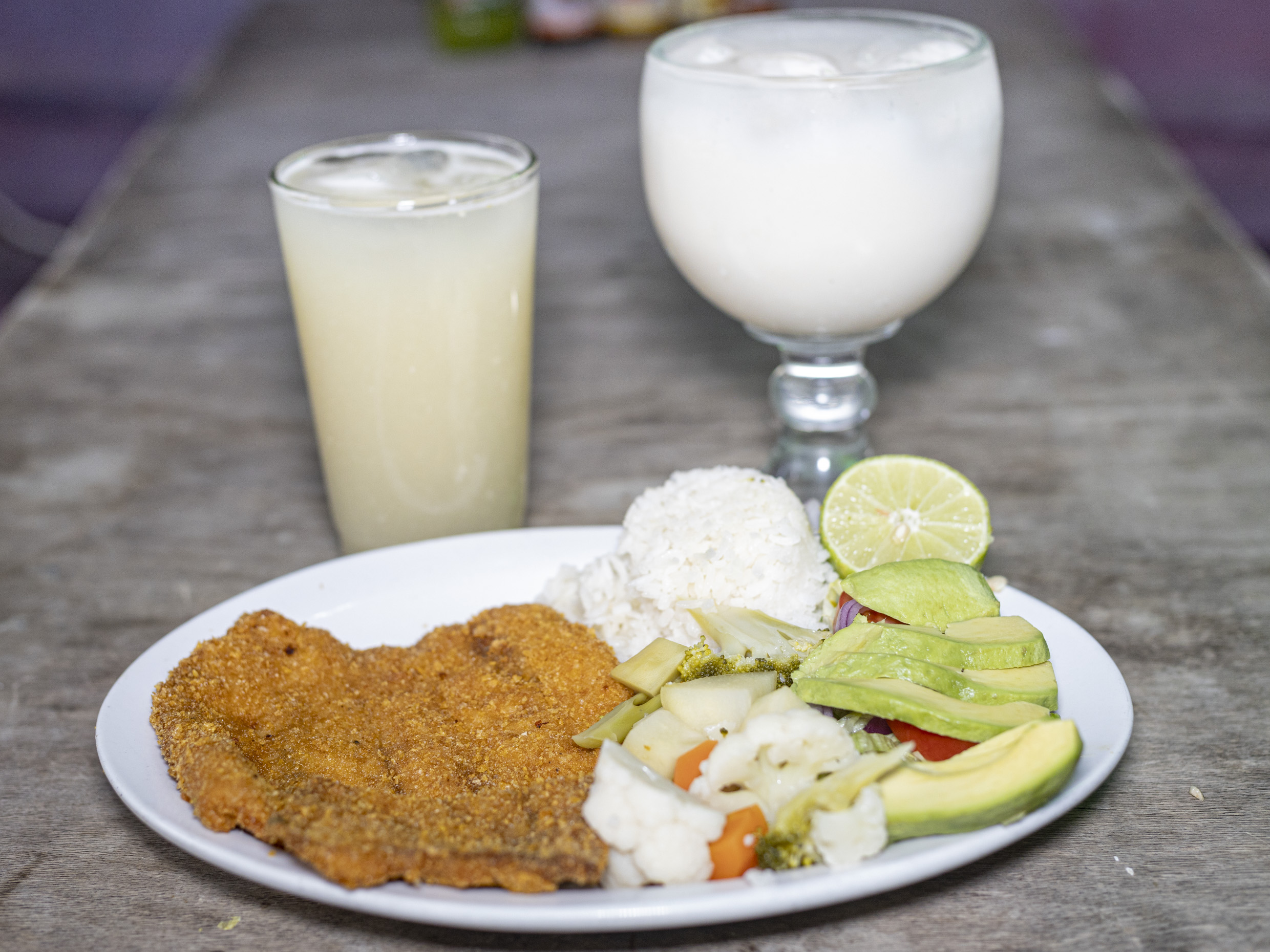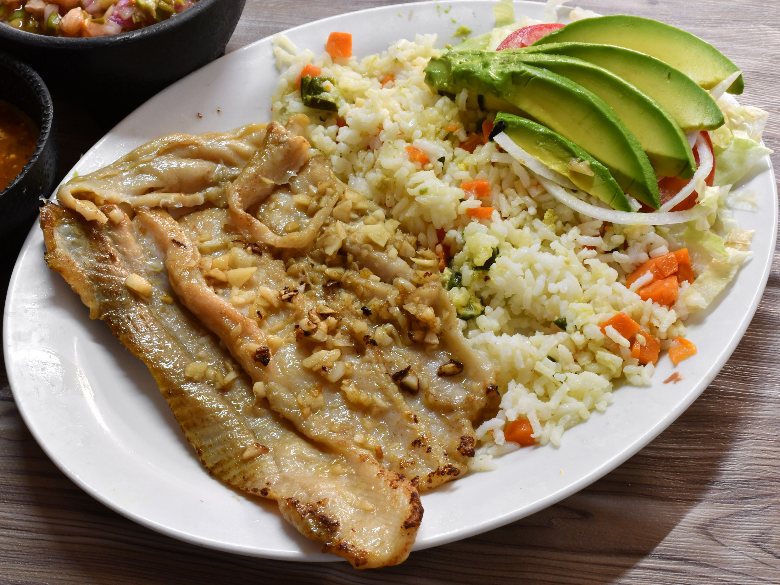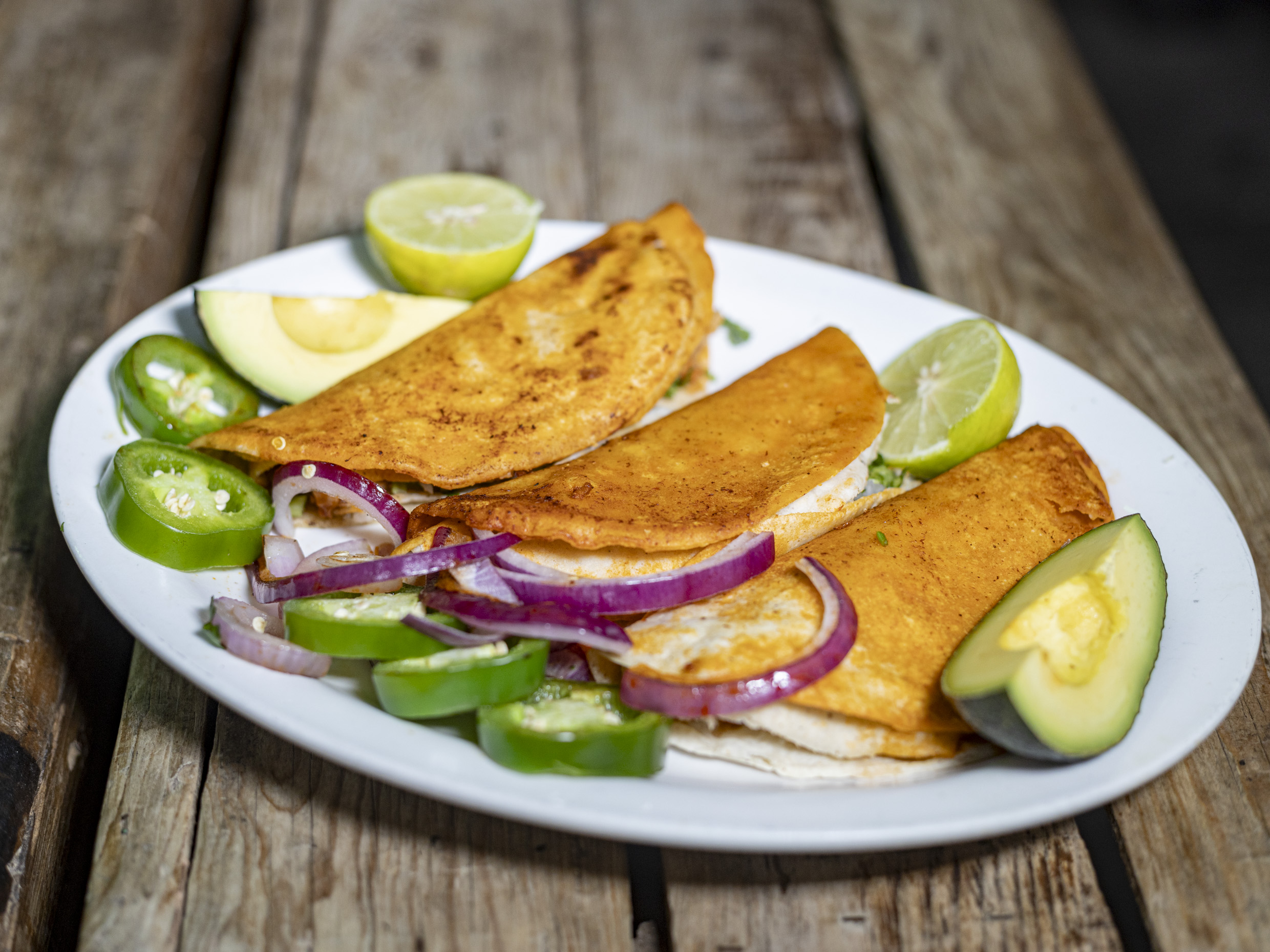3 tacos con aprox.40 GR de pescado cada uno acompañados con medio litro de agua chica.