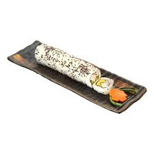 Rollo envuelto en ajonjolí relleno de camarón, pepino y aguacate.