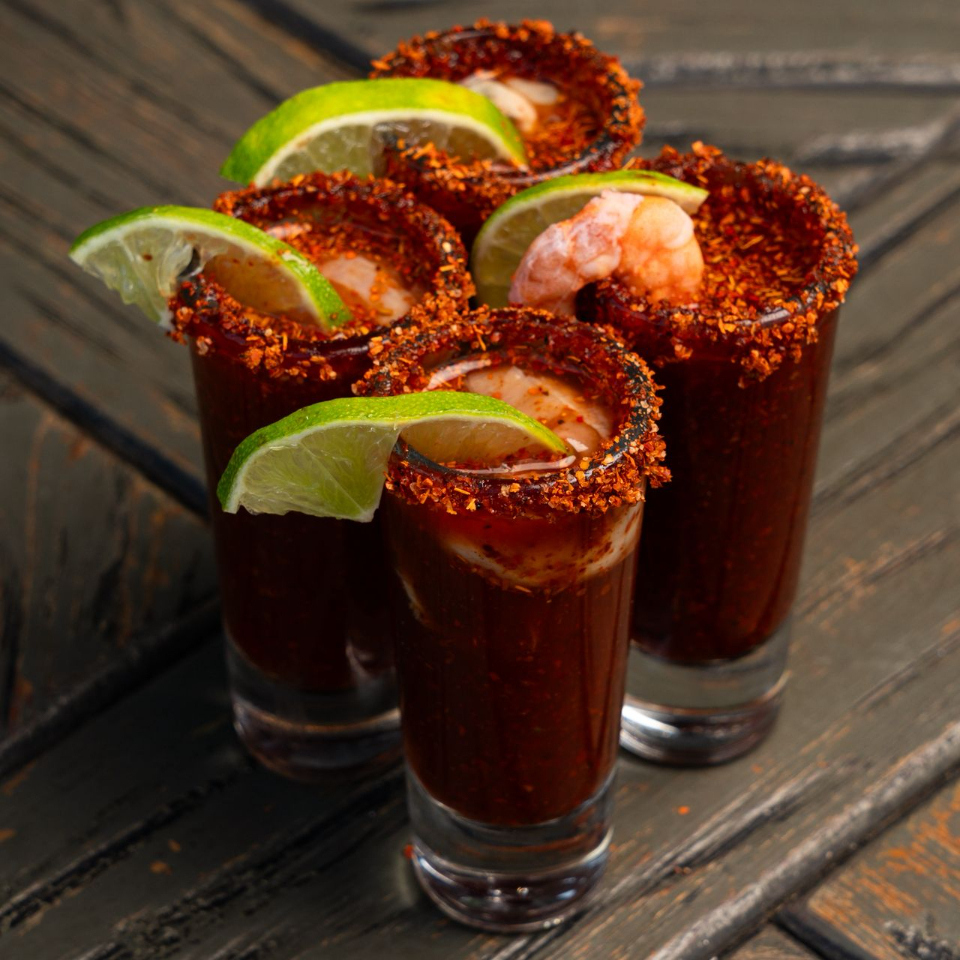 Shot de Clamato especial de la casa con ostión viagra del mar.