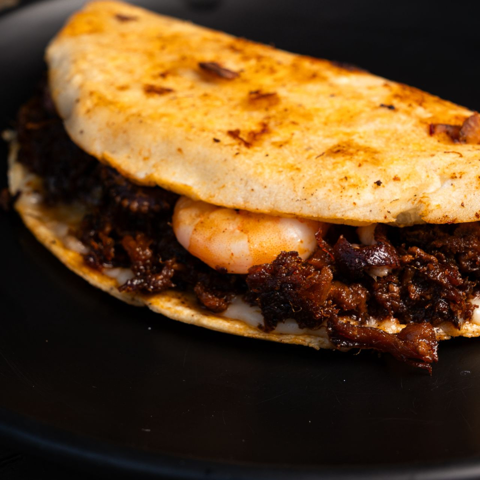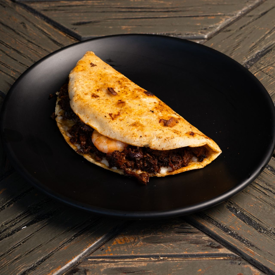 Quesadilla de chilorio con camarón y pulpo.