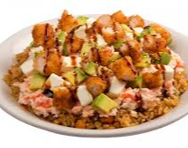 Alga por fuera, relleno de camarón, ensalada de cani, con topping de ensalada marina.