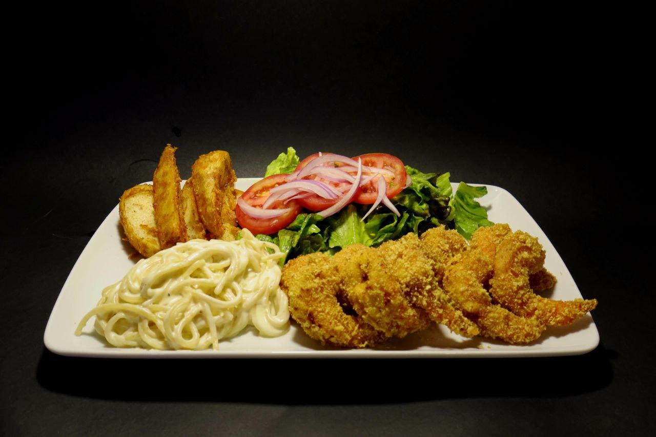 Camarones empanizados y dorados al punto perfecto, acompañados de ensalada fresca, pasta y papas gajo doradas. Crujientes, sabrosos y con el equilibrio ideal entre textura y sabor.