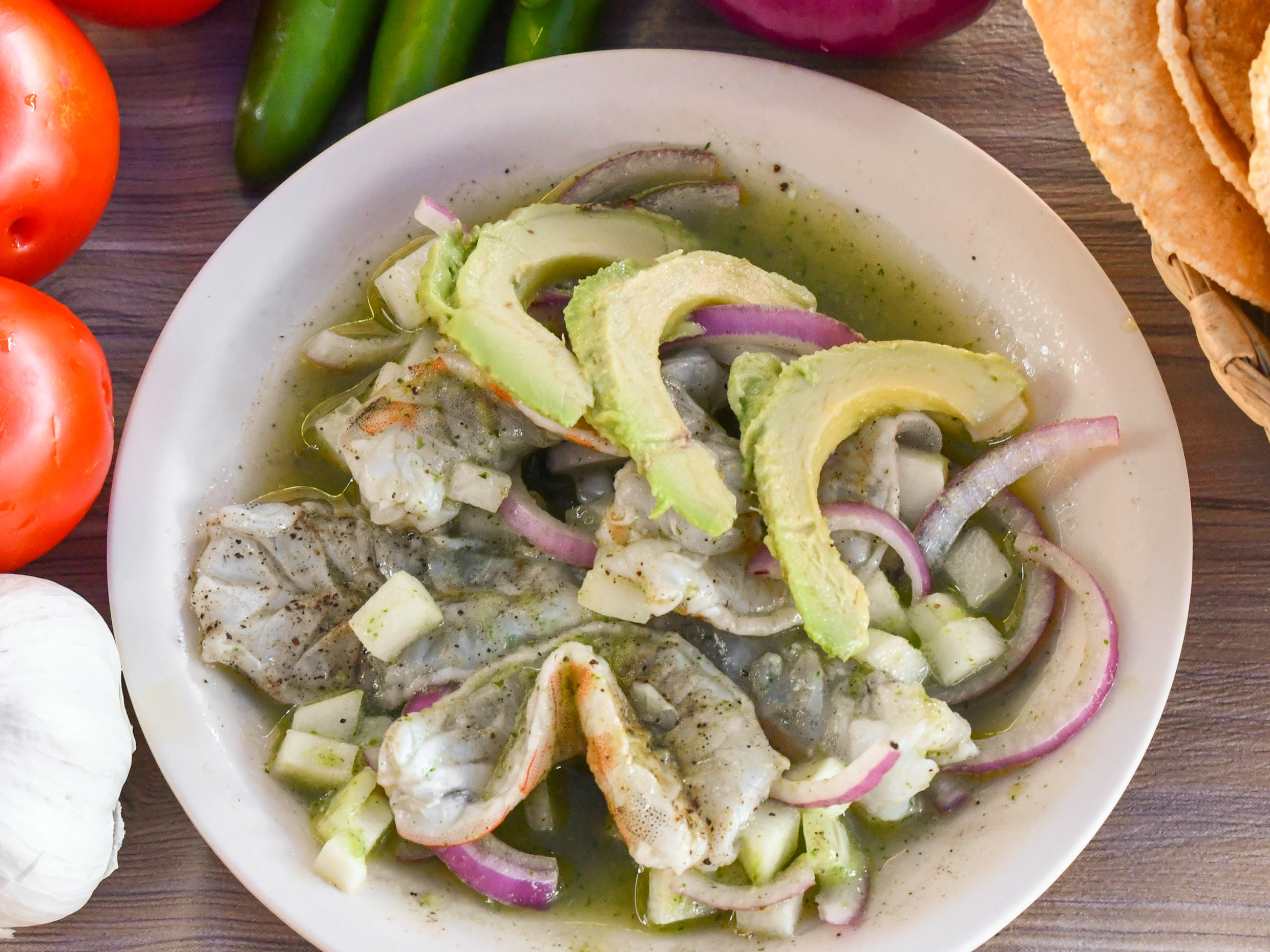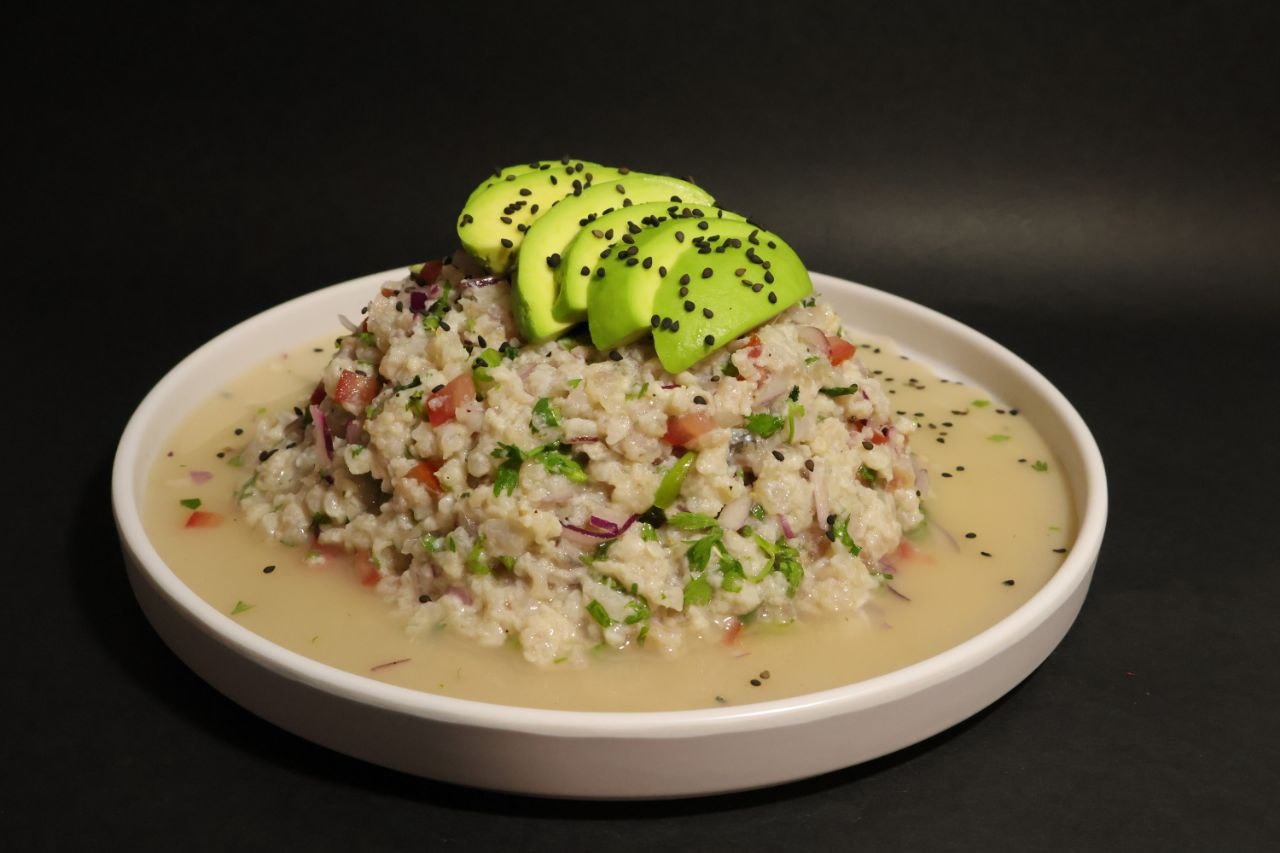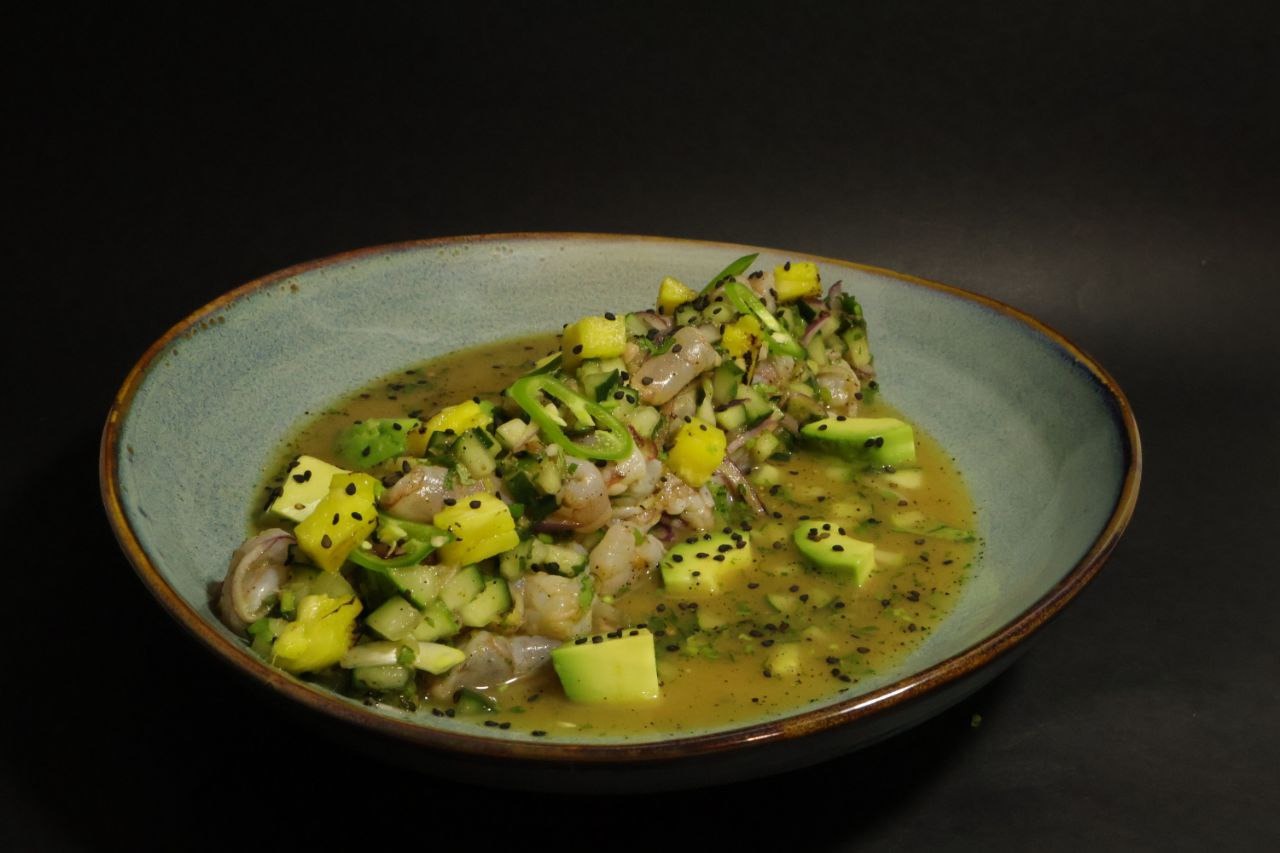 Ceviche con cebolla morada, tomate, pepino, cilantro y aguacate.
