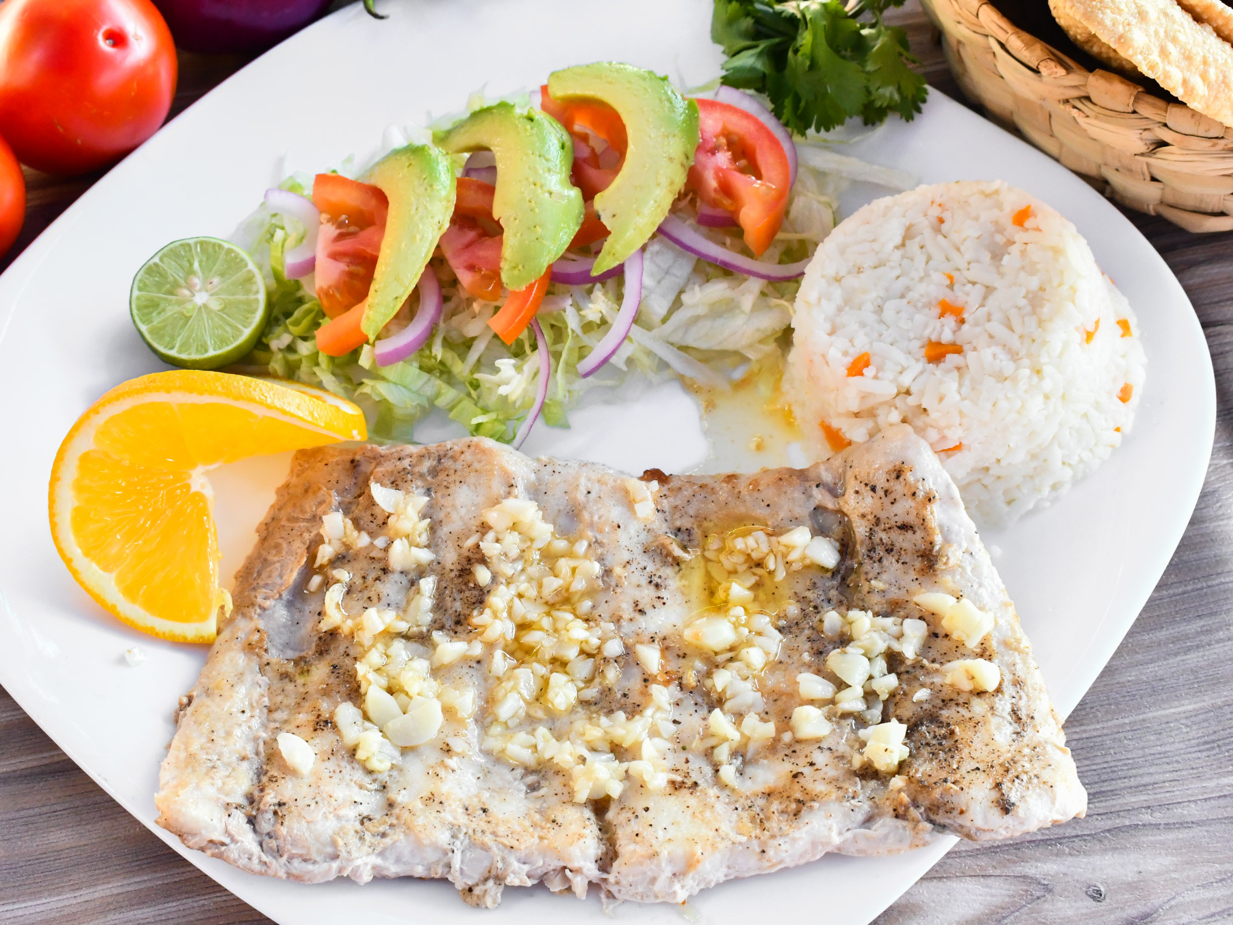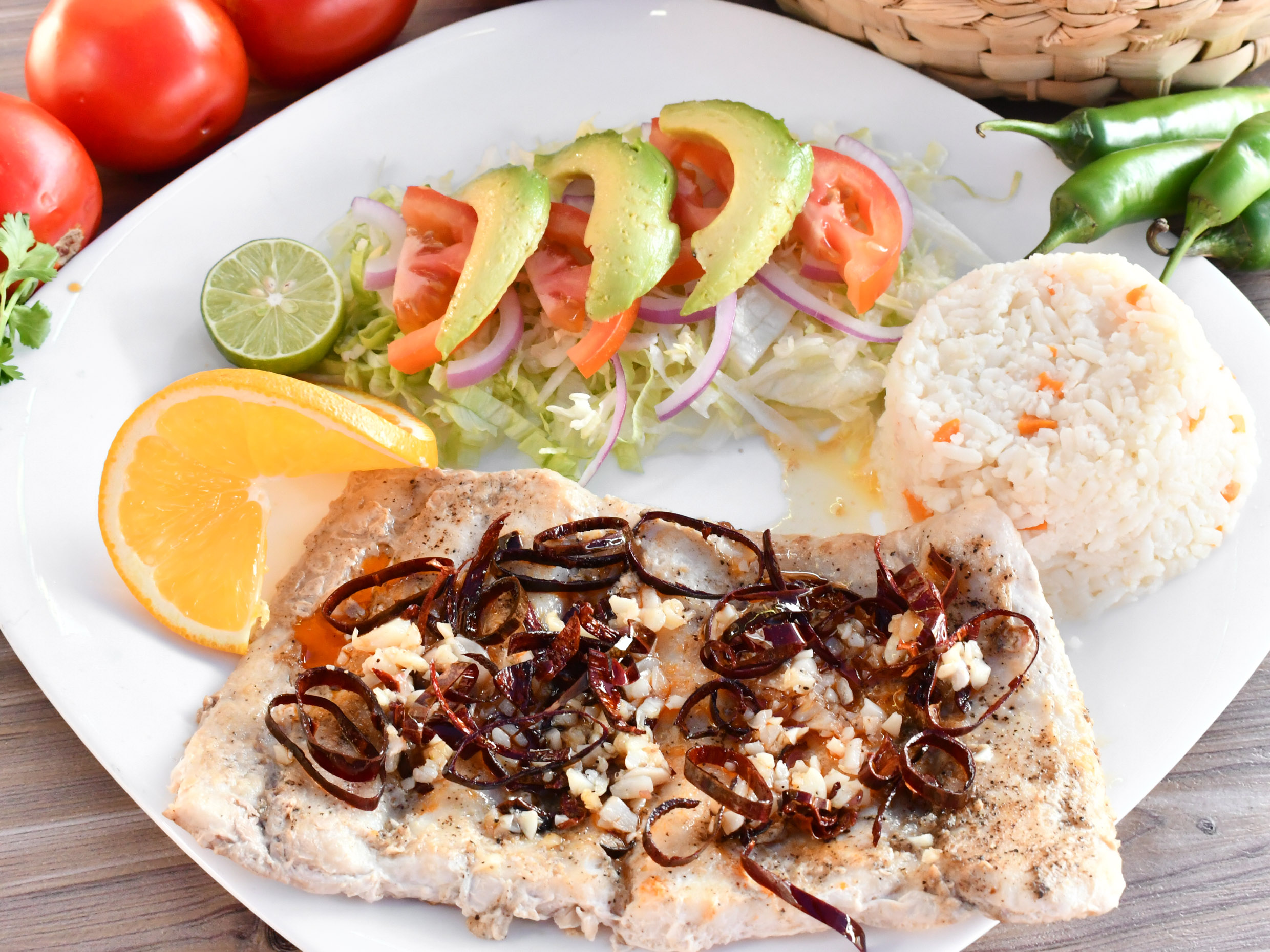 Filete Sarteneado (200 g) Filete de pescado cocinado a la sartén con mantequilla, ajo picado y un toque de pimienta que resalta su sabor natural. Acompañado de ensalada, de arroz o papas gajo.