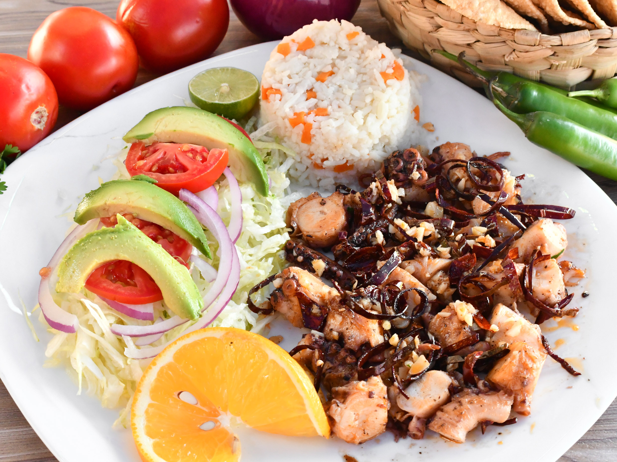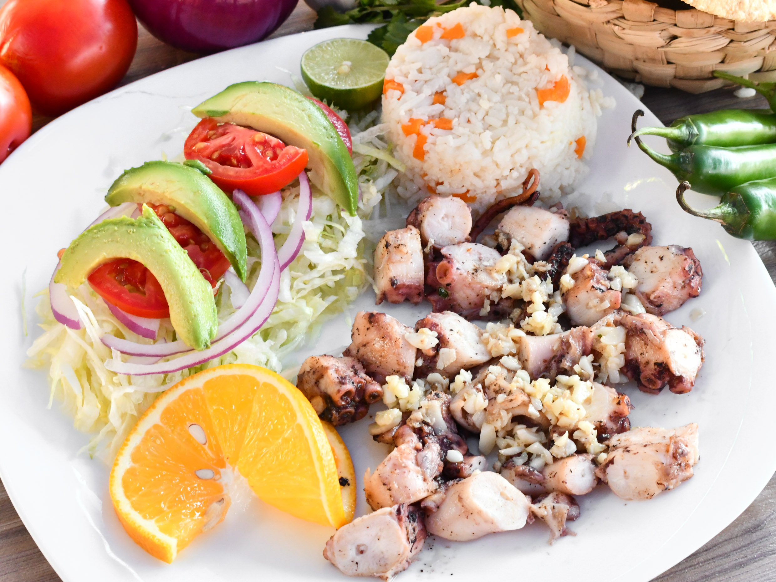 Pulpo sarteneado con mantequilla y chile guajillo, acompaño con ensalada y arroz.