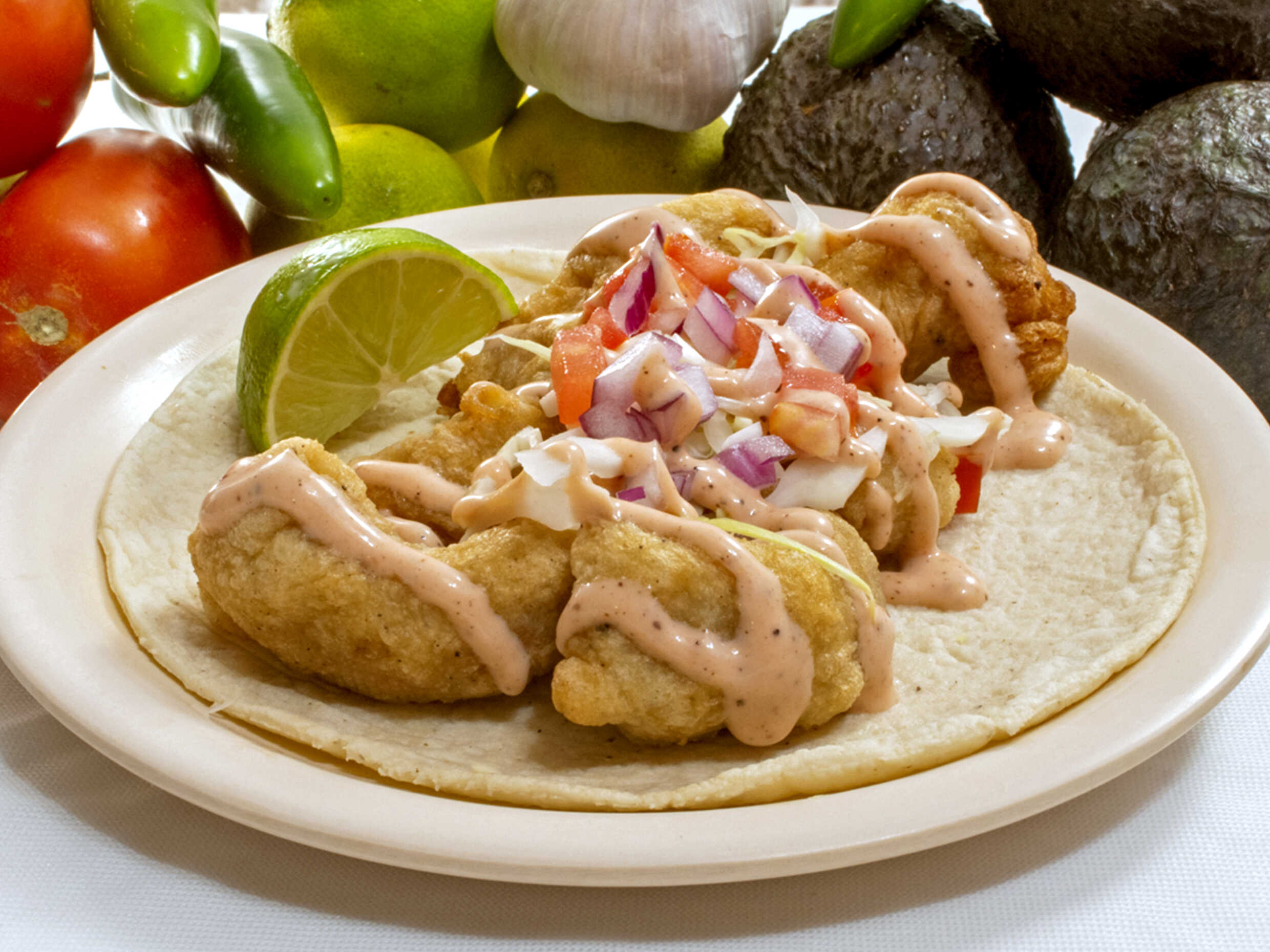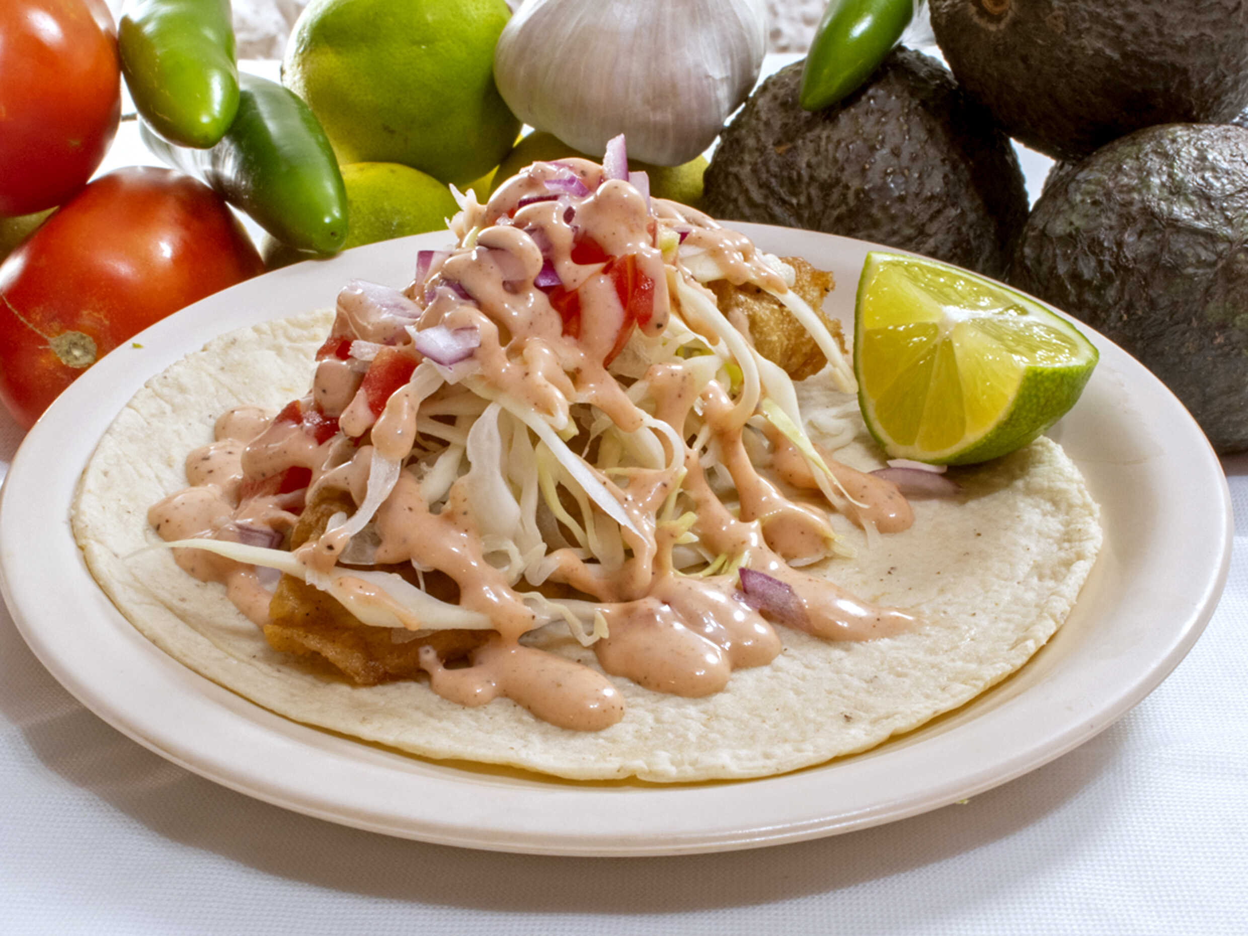 Pescado capeado servido en una tortilla de maíz, con jitomate, cebolla, col y aderezo especial.