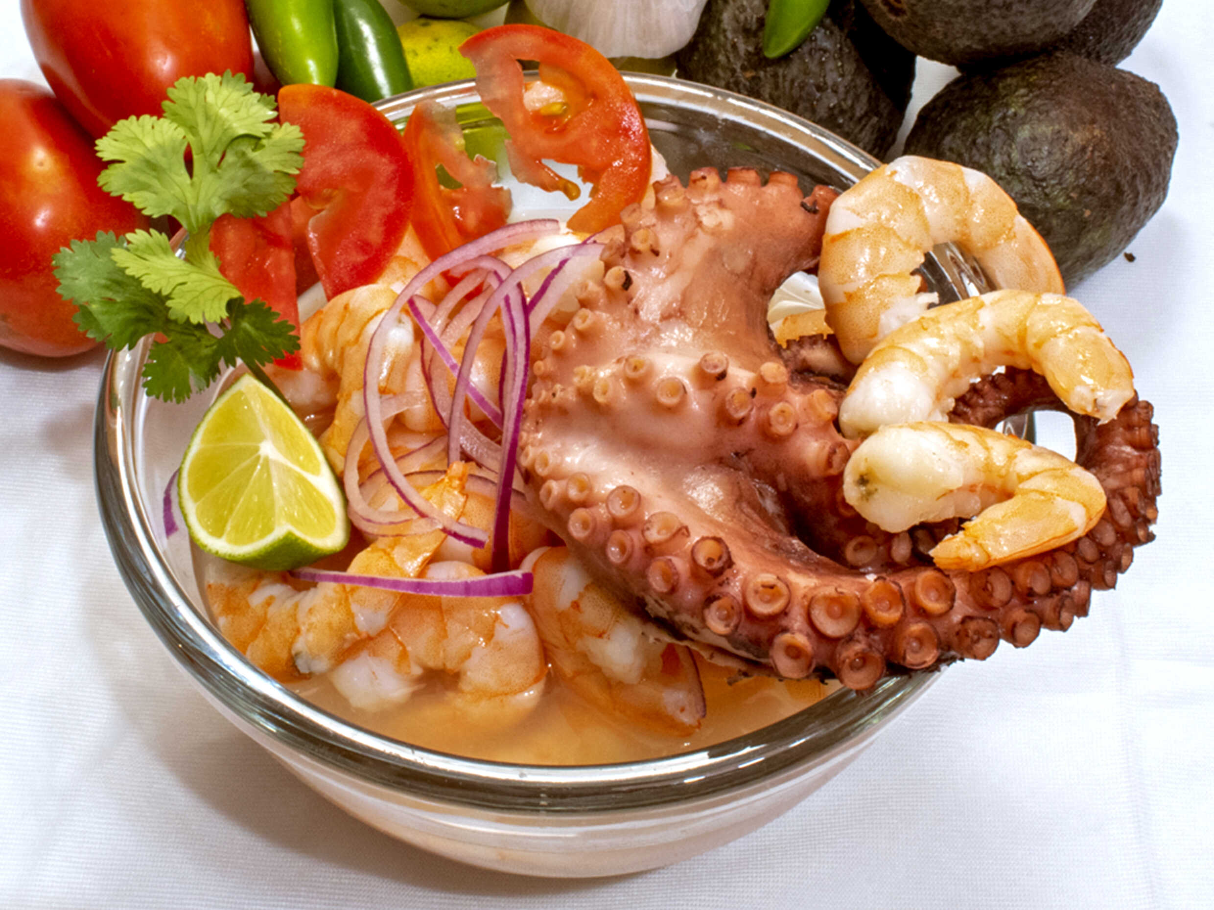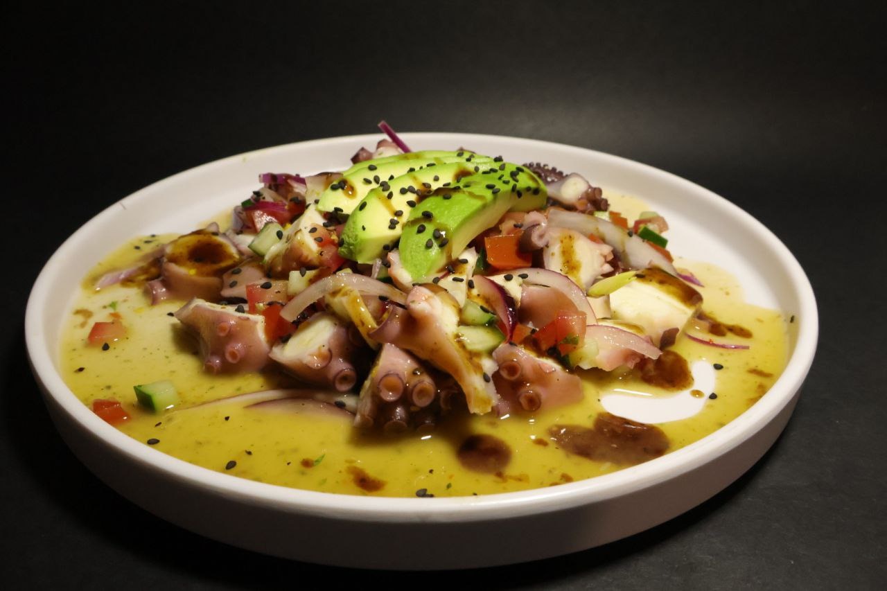🦐 Ceviche de Pulpo (150 g) preparados con una mezcla fresca de jitomate, cebolla morada, pepino, cilantro y jugo de limón, sazonados con un toque de sal y pimienta. Servido frío y acompañado de aguacate y tostadas.
