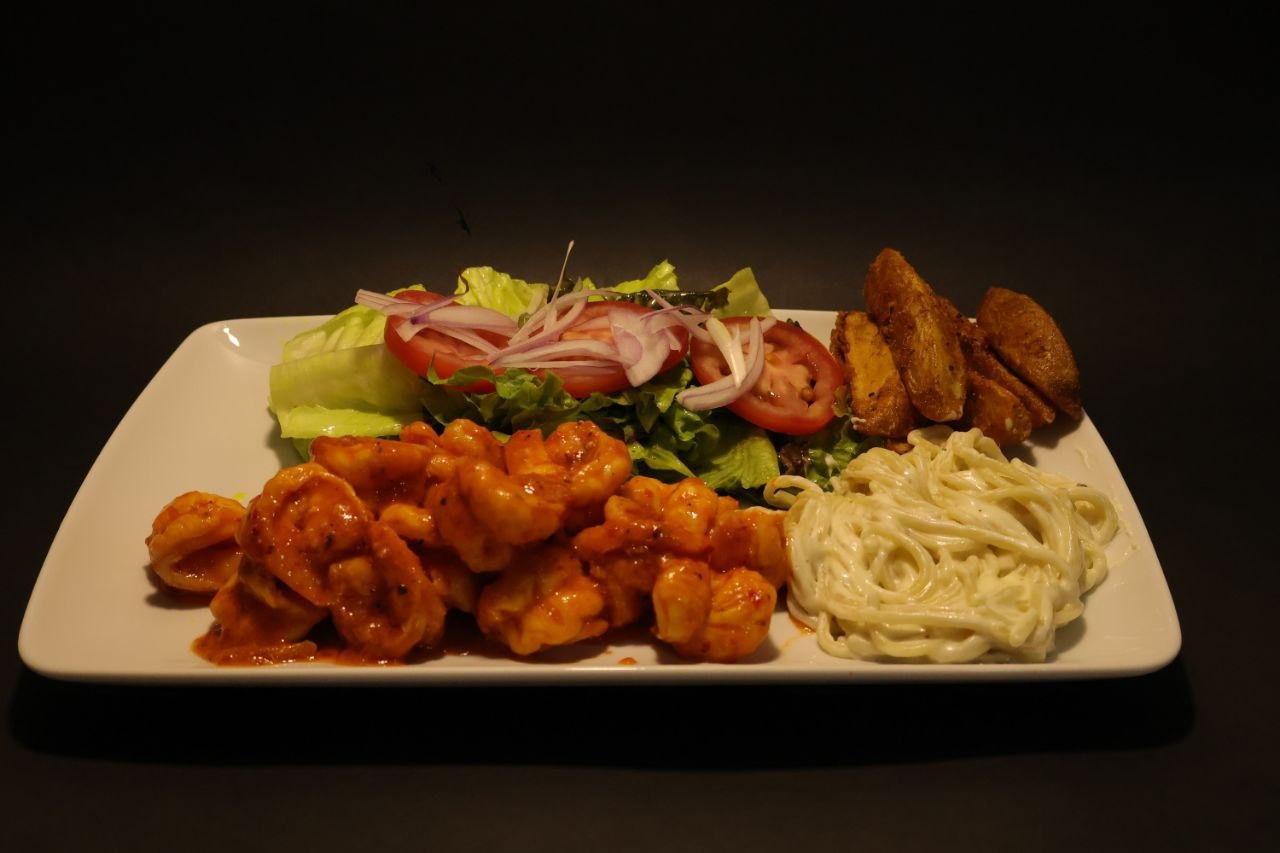 Camarones a la Diabla acompañados de ensalada fresca, pasta y papas gajo doradas. Crujientes, sabrosos y con el equilibrio ideal entre textura y sabor.