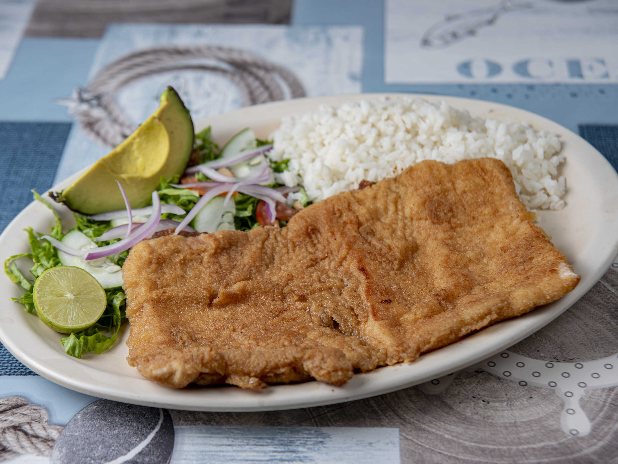 Orden de 195 gramos de filete de pescado empanizado con pan molido. Acompañado con arroz blanco y ensalada, incluye lechuga, jitomate, pepino, cebolla morada, aguacate y limón.