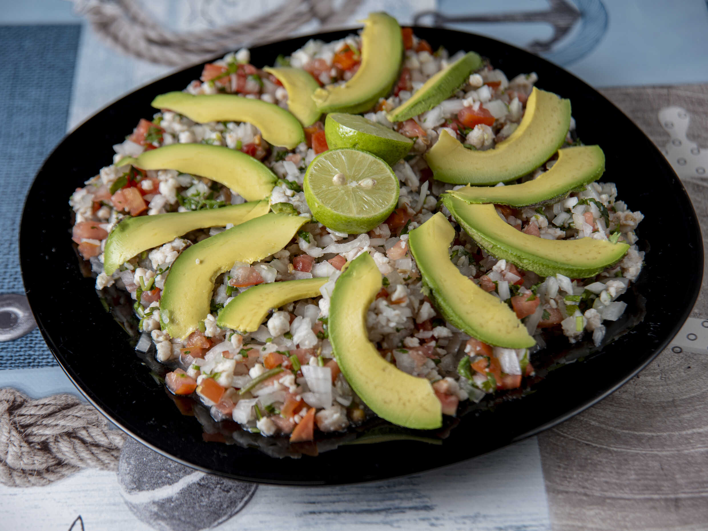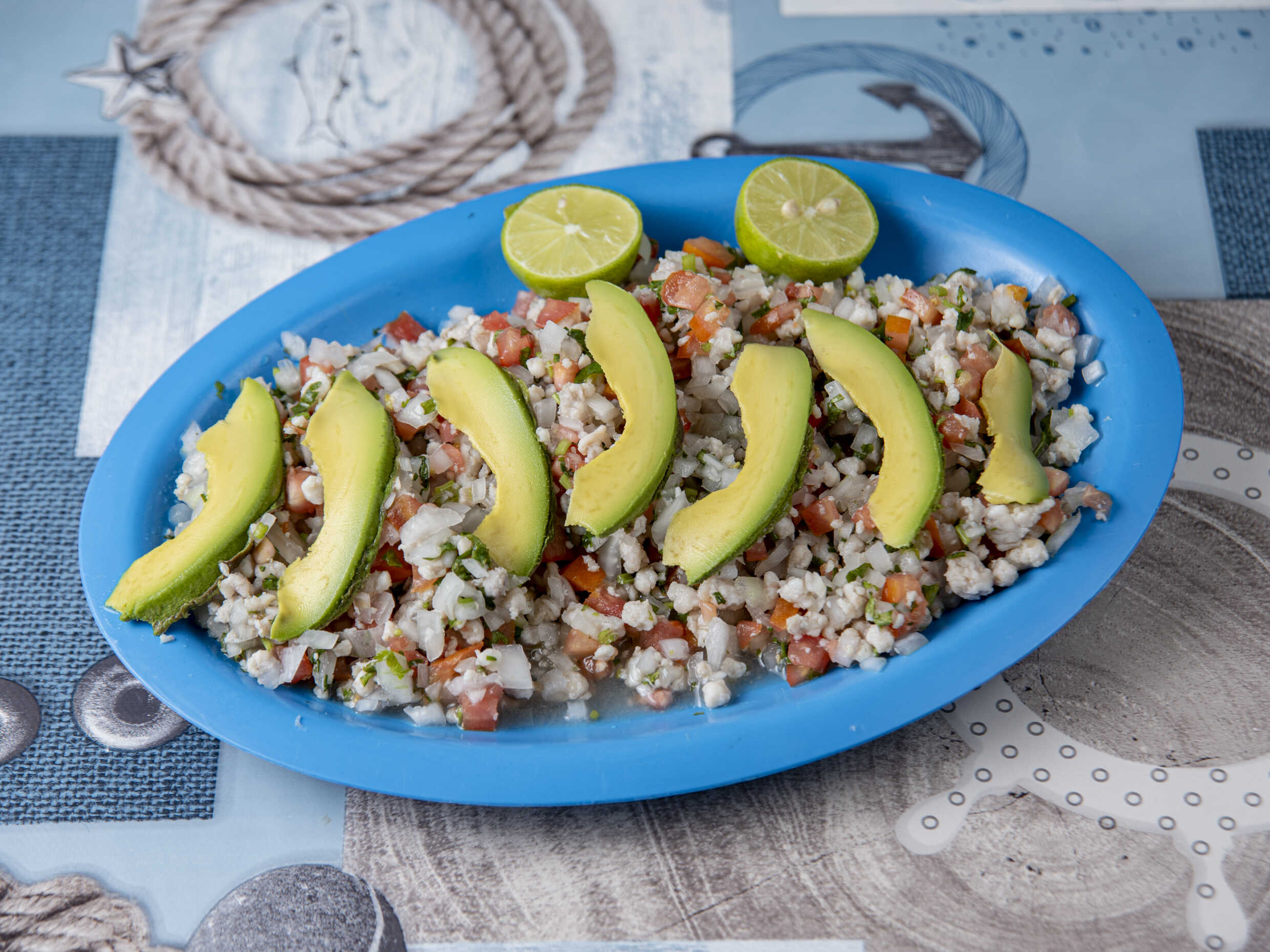 Orden de 1 litro de cóctel con ceviche de pescado. Con ceviche de pescado, jitomate, cebolla, cilantro, aguacate, cátsup y limón.