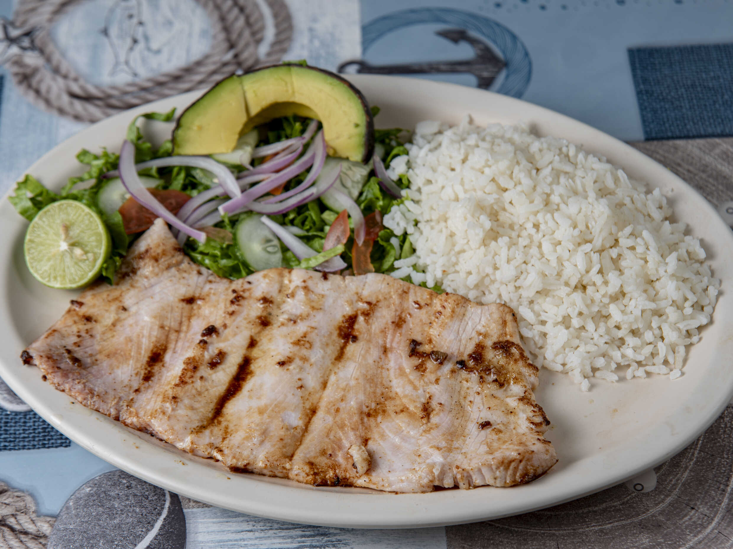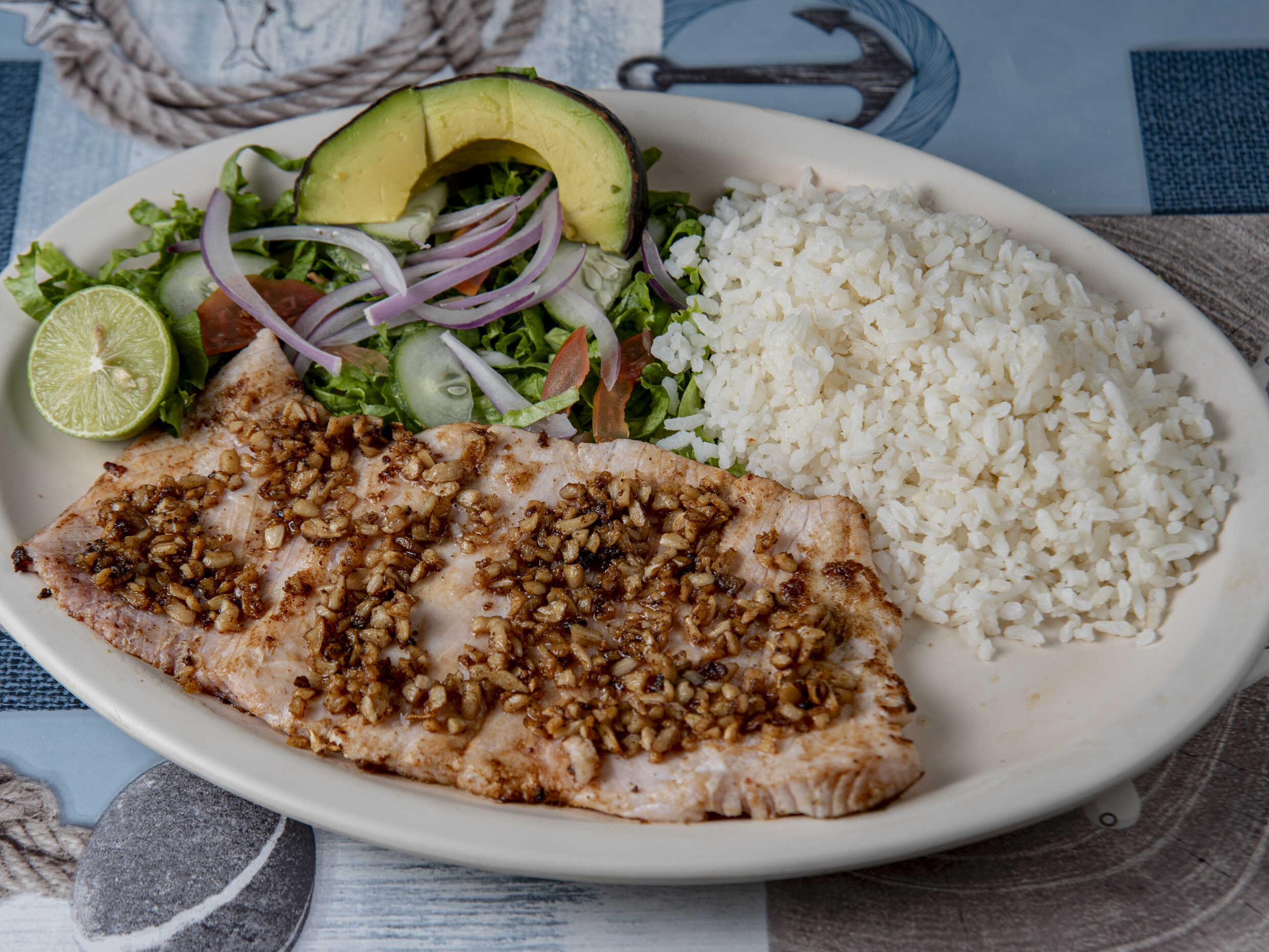Orden de 195 gramos de filete de pescado con ajo picado especial. Acompañado con arroz blanco y ensalada, incluye lechuga, jitomate, pepino, cebolla morada, aguacate y limón. El filete se sazona con especies y ajo picado.