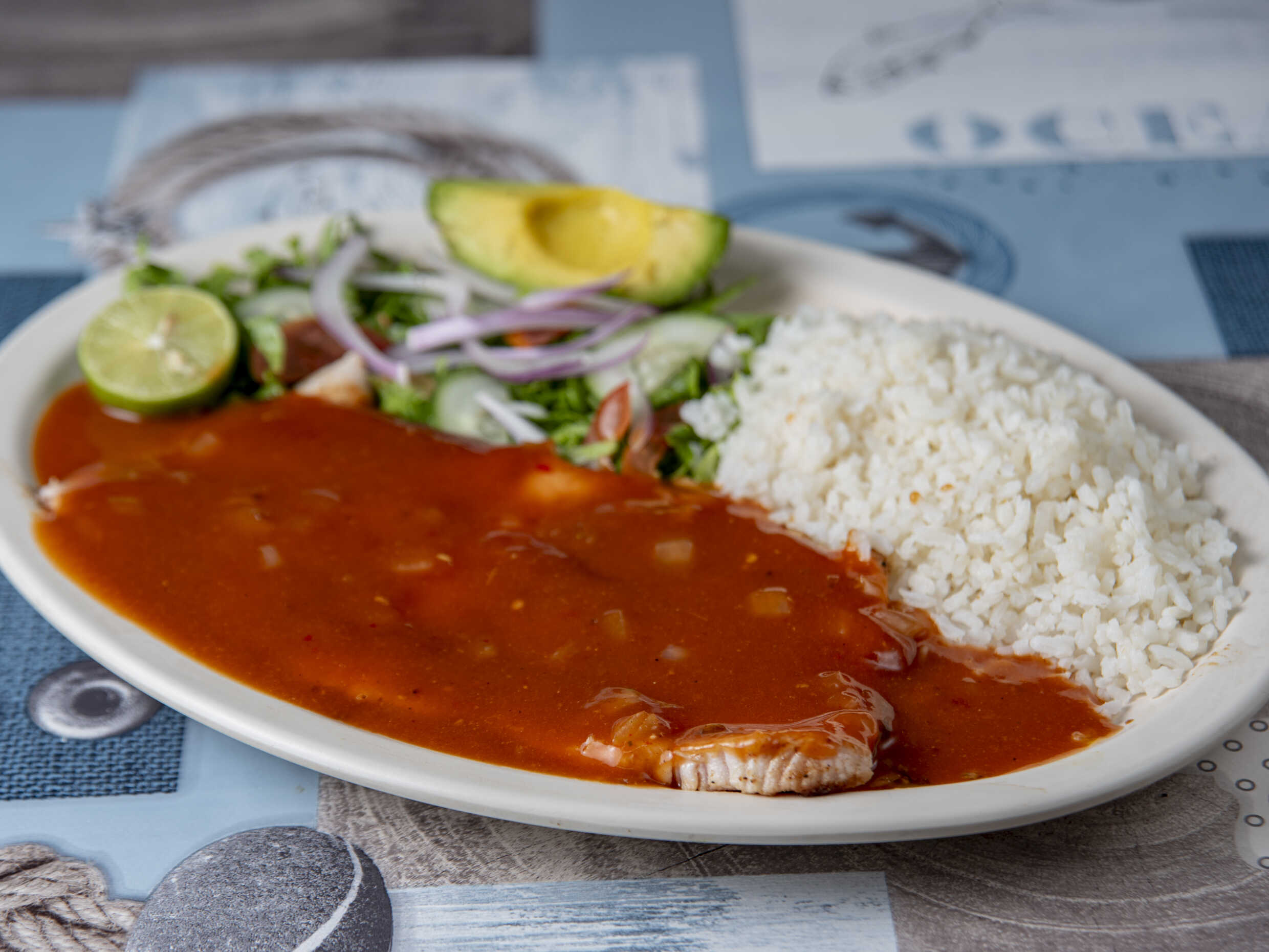 Orden de 195 gramos de filete de pescado con salsa a la diabla. Acompañado con arroz blanco y ensalada, incluye lechuga, jitomate, pepino, cebolla morada, aguacate y limón. El filete se sazona con salsa, chile y salsa cátsup.