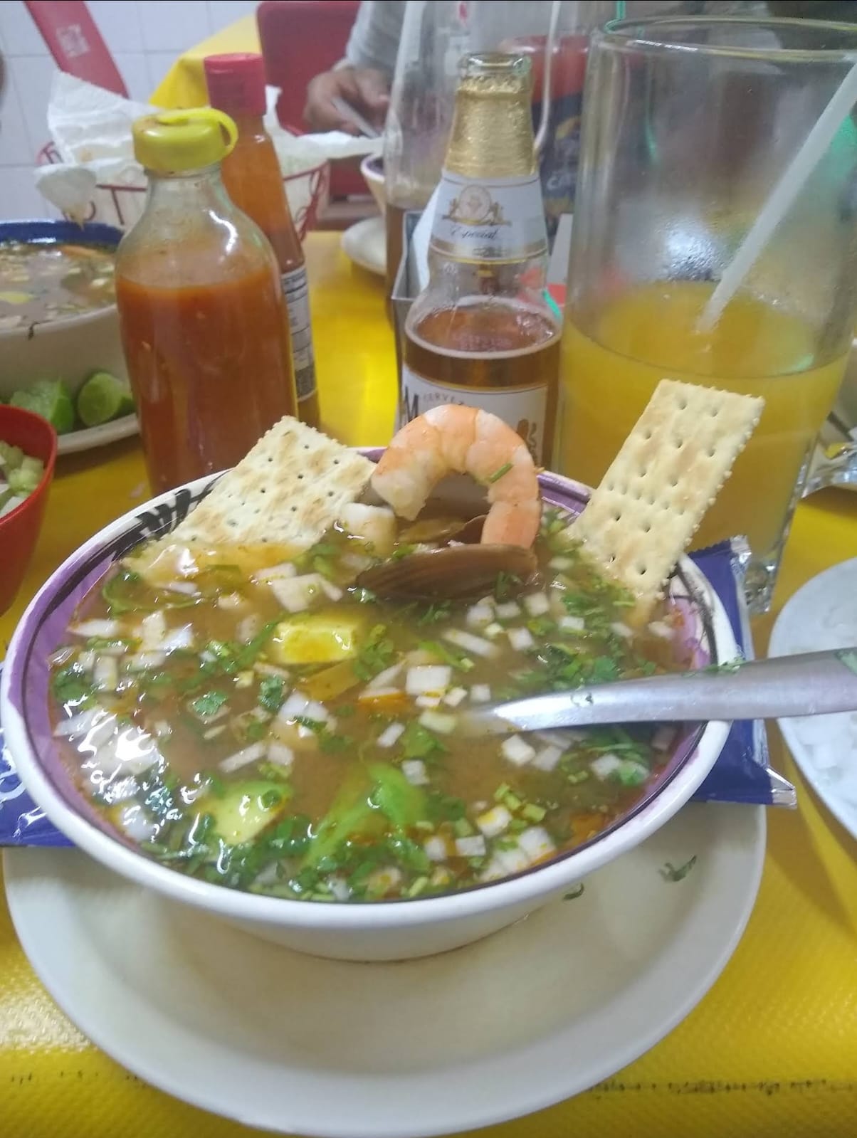 CAMARON, PULO, OSTION, PESCADO Y ALMEJA CHOCOLATA PREPARADO EN UN CALDO ROJO CON VERDURAS COCIDAS: CHAYOTE, COL, MORRON, ZANAHORIA, APIO Y PEREJIL