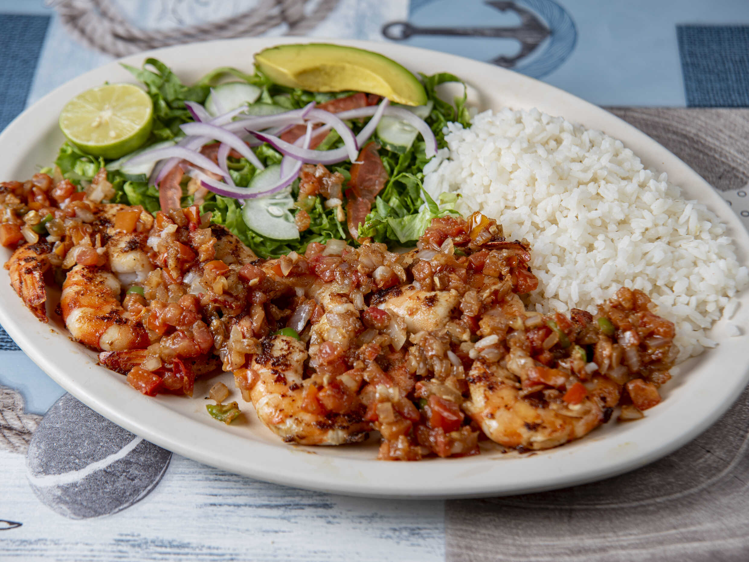 Orden de 180 gramos de camarón con salsa a la mexicana. Acompañado con arroz blanco y ensalada, incluye lechuga, jitomate, pepino, cebolla morada, aguacate y limón. Los camarones se sazonan con especies, jitomate, cebolla y chile verde.