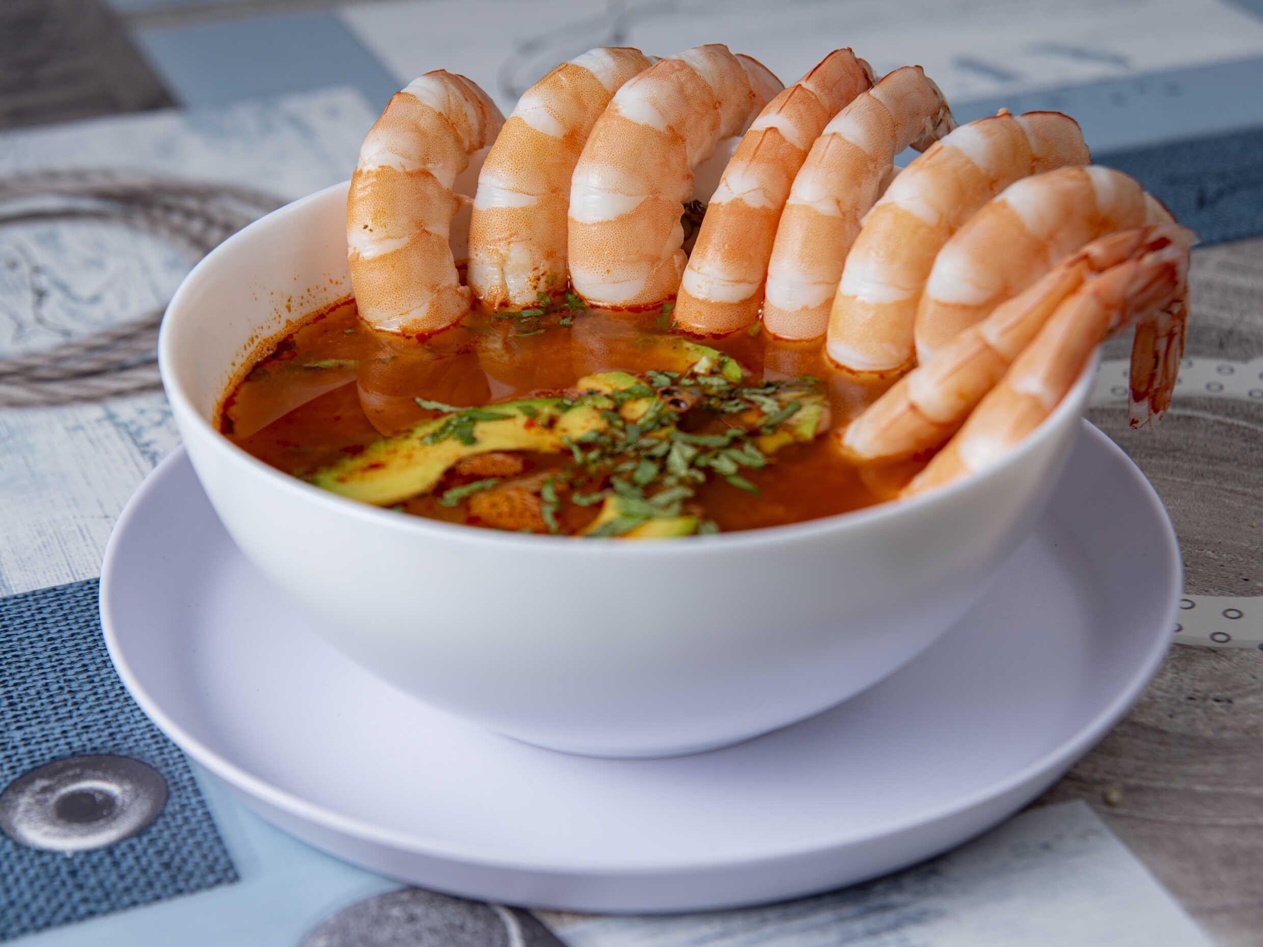 CAMARON FRESCO, PREPARADO EN UN CALDO ROJO CON VERDURAS COCIDAS: CHAYOTE, COL, MORRON, ZANAHORIA, APIO Y PEREJIL