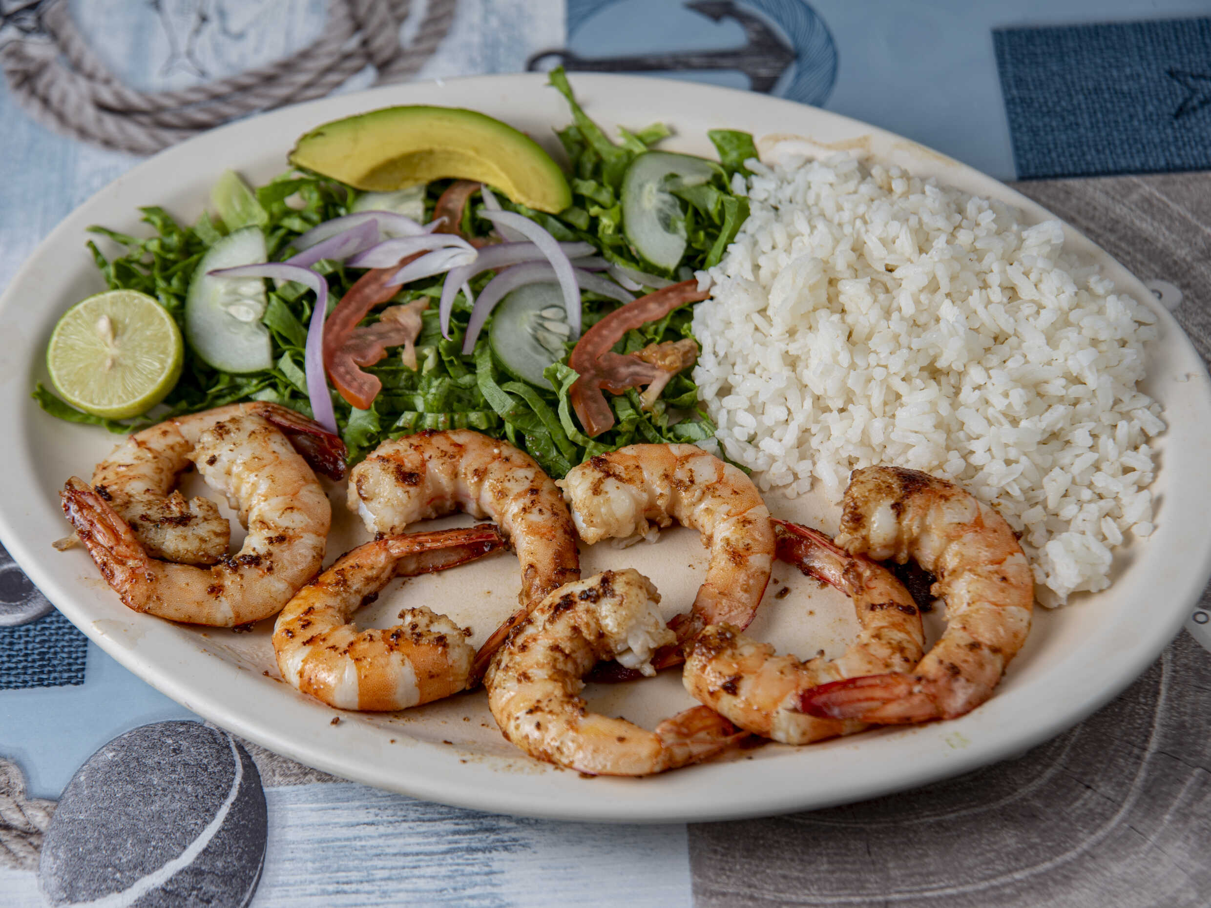 Orden de 180 gramos de camarón con ajo picado especial. Acompañado con arroz blanco y ensalada, incluye lechuga, jitomate, pepino, cebolla morada, aguacate y limón. Los camarones se sazonan con especies y ajo picado.