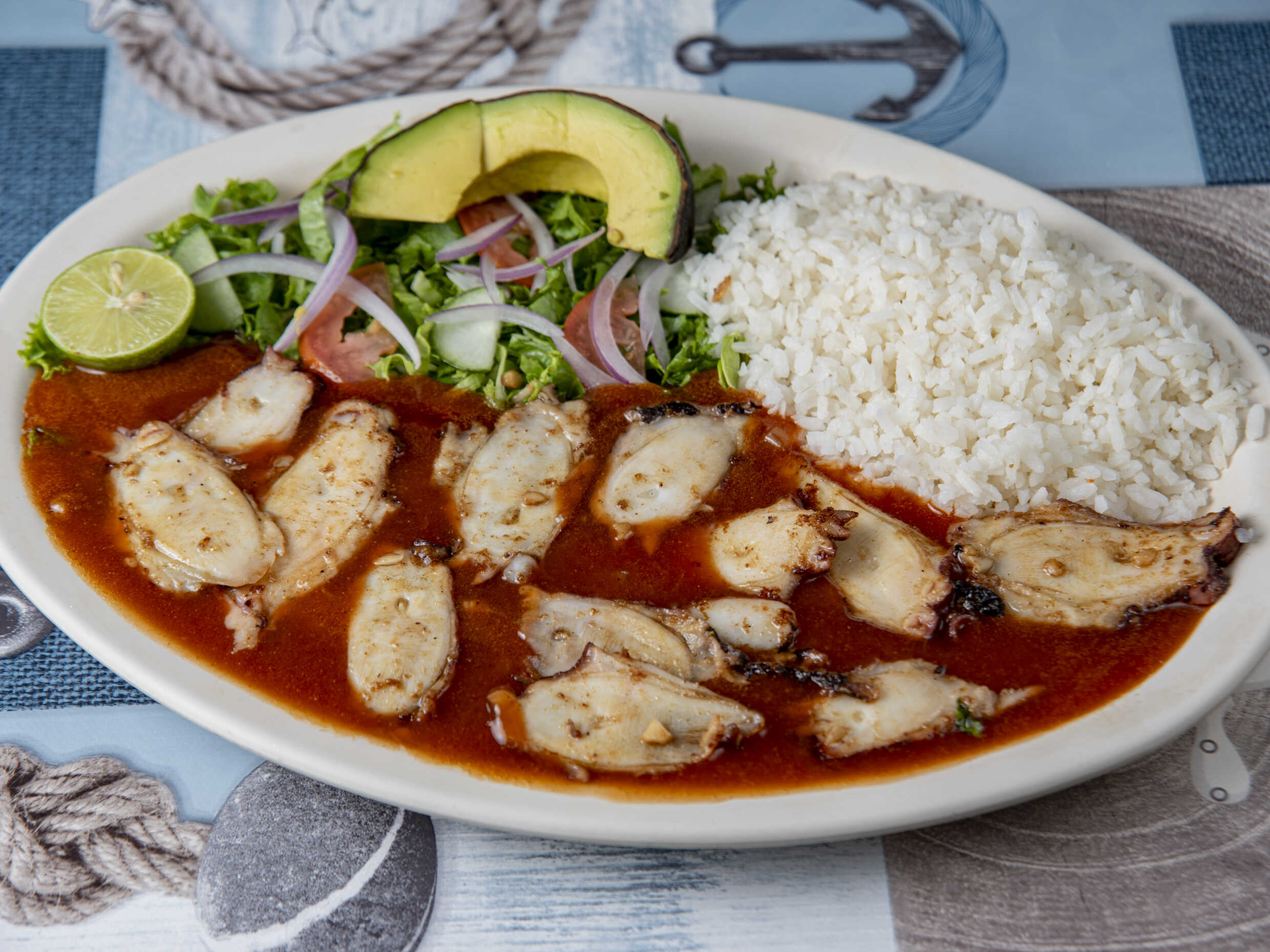 Orden de 190 gramos de pulpo con salsa a la diabla. Acompañado con arroz blanco y ensalada, incluye lechuga, jitomate, pepino, cebolla morada, aguacate y limón. El pulpo se sazona con especies y ajo picado.