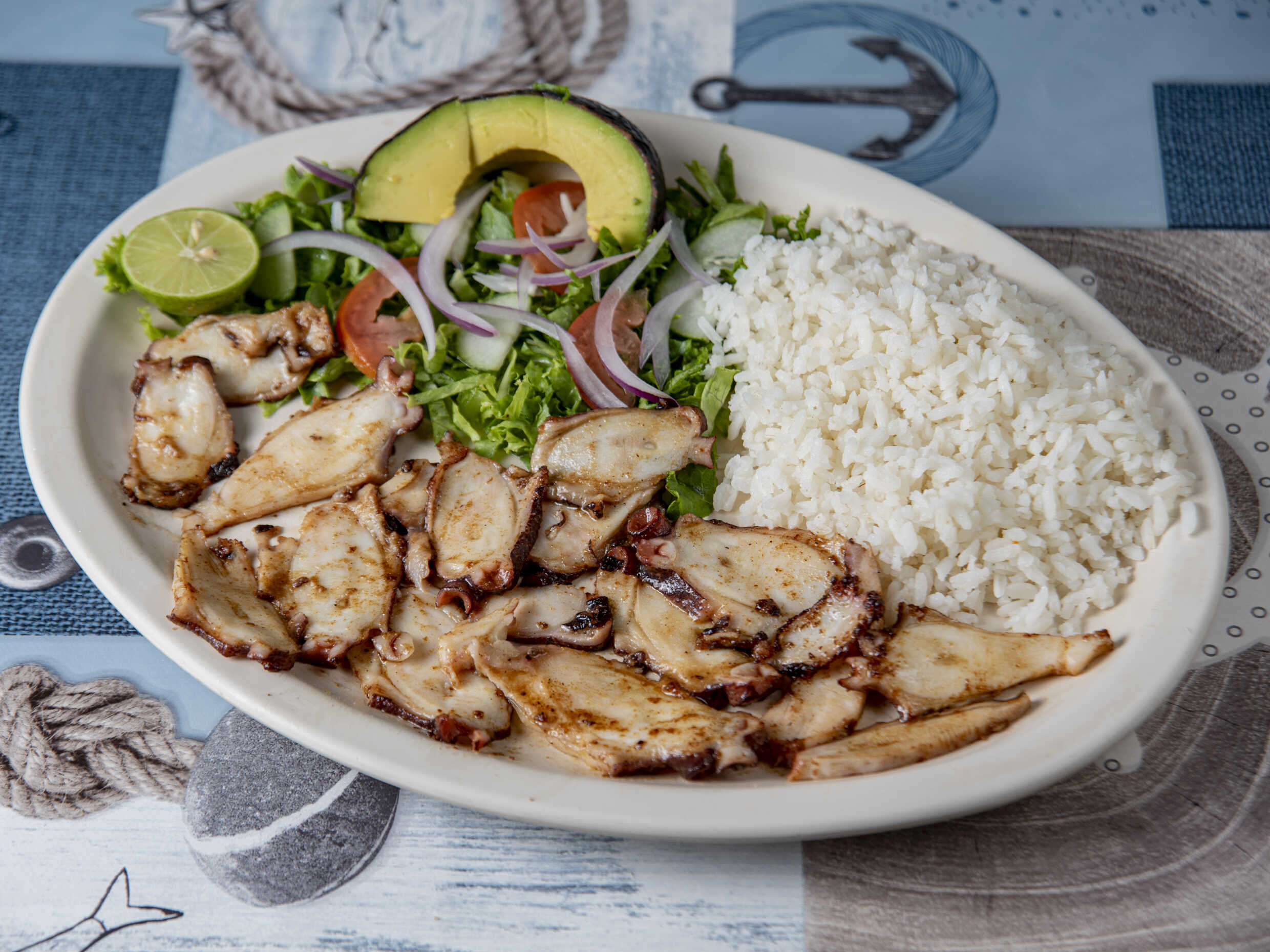 Orden de 190 gramos de pulpo con ajo picado especial. Acompañado con arroz blanco y ensalada, incluye lechuga, jitomate, pepino, cebolla morada, aguacate y limón. El pulpo se sazona con especies y ajo picado.