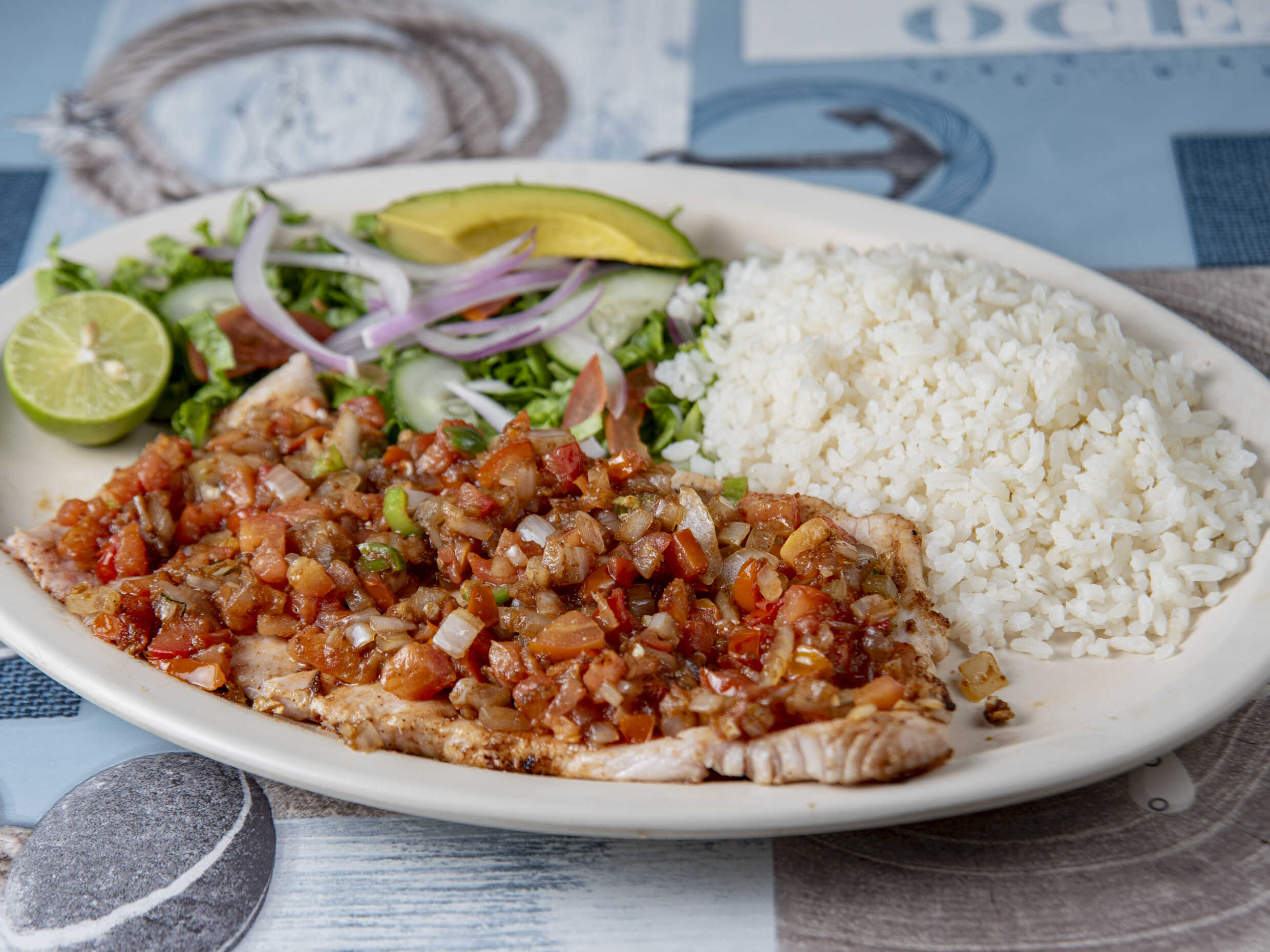 Orden de 195 gramos de filete de pescado con salsa a la mexicana. Acompañado con arroz blanco y ensalada, incluye lechuga, jitomate, pepino, cebolla morada, aguacate y limón. El filete se sazona con especies, jitomate, cebolla y chile verde.