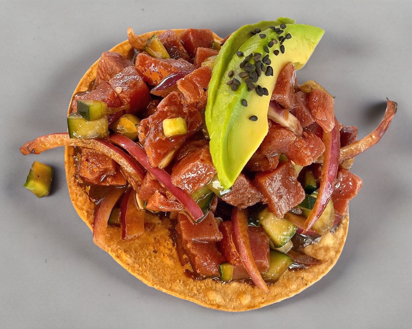Trozos de atún curtidos en limón, salsa especial, aceite de olivo trozos de pepino y rodajas de cebolla.