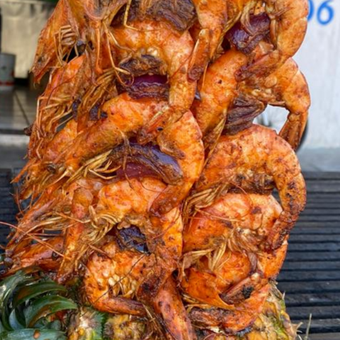 4 o 5 camarones zrandeados a las brazas con mantequilla y adobo.