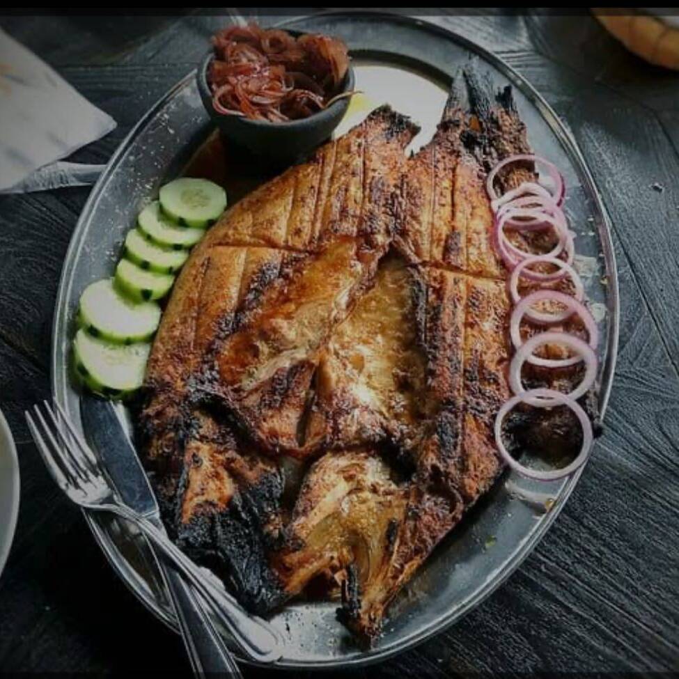 Pescado a las brazas, de 2 kg a 2.5 kg acompañado de sopa de arroz, tortillas, ensalada fresca.