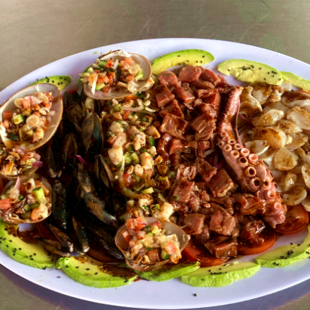 Botana acompañada de almeja, camarón, pulpo, callo, atún y mejillón, con una salsa negra especial acompañada de chile chiltelpin.
