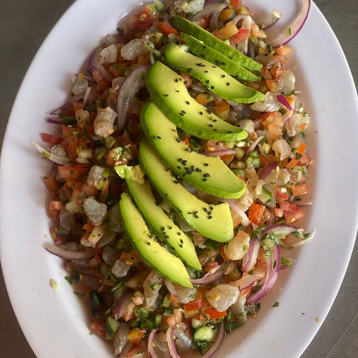 Camarón, pulpo, cebolla, jítomate, pepino, aguacate, salsa especial negra (no picosa).