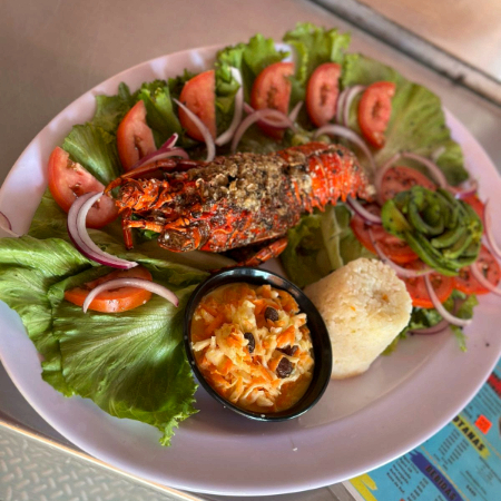 Langosta guisada en una salsa especial de mantequilla y finas hiervas, acompañada de ensalada dulce ensalada fresca y sopa de arroz..
